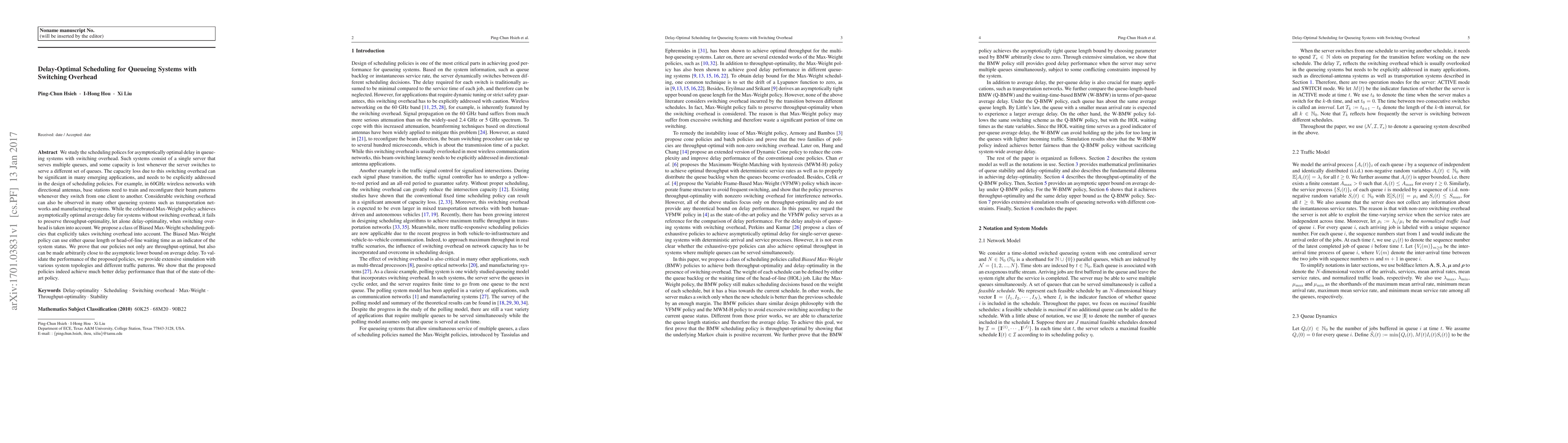 This paper proposes Biased Max-Weight scheduling policies to achieve asymptotically optimal delay in queueing systems with significant switching overhead, such as in 60GHz wireless networks and manufacturing systems. These policies outperform the traditional Max-Weight policy by addressing throughput and delay optimization through extensive simulations.