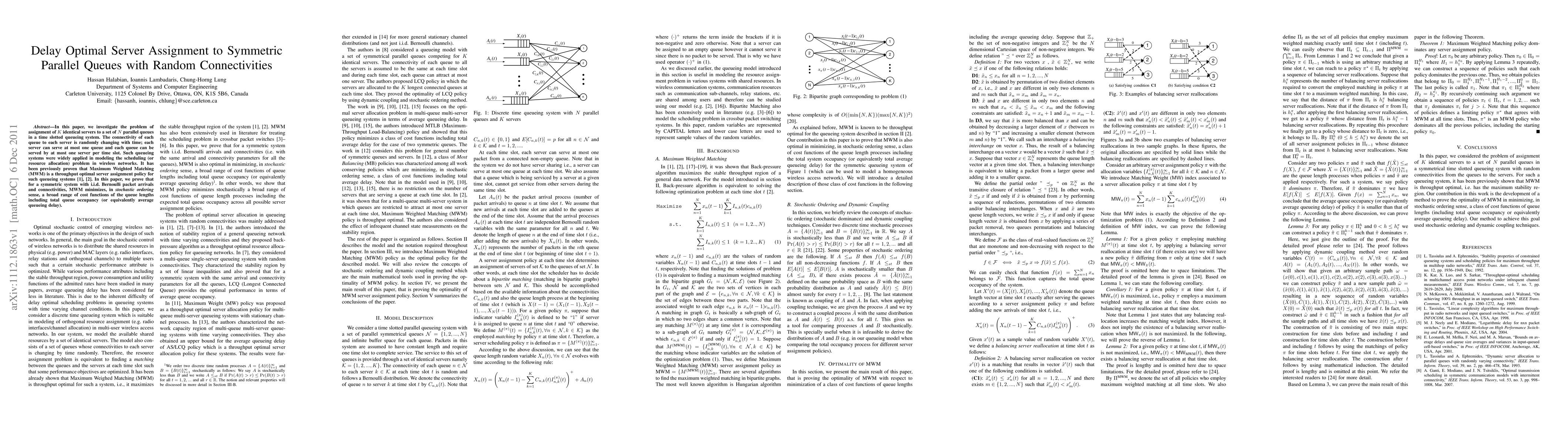 This paper studies the optimal assignment of $K$ servers to $N$ parallel queues in a time-slotted system with random connectivities, focusing on minimizing average queueing delay. It proves that Maximum Weighted Matching (MWM) is optimal for a symmetric system with i.i.d. Bernoulli arrivals and connectivities, minimizing a range of cost functions related to queue lengths.