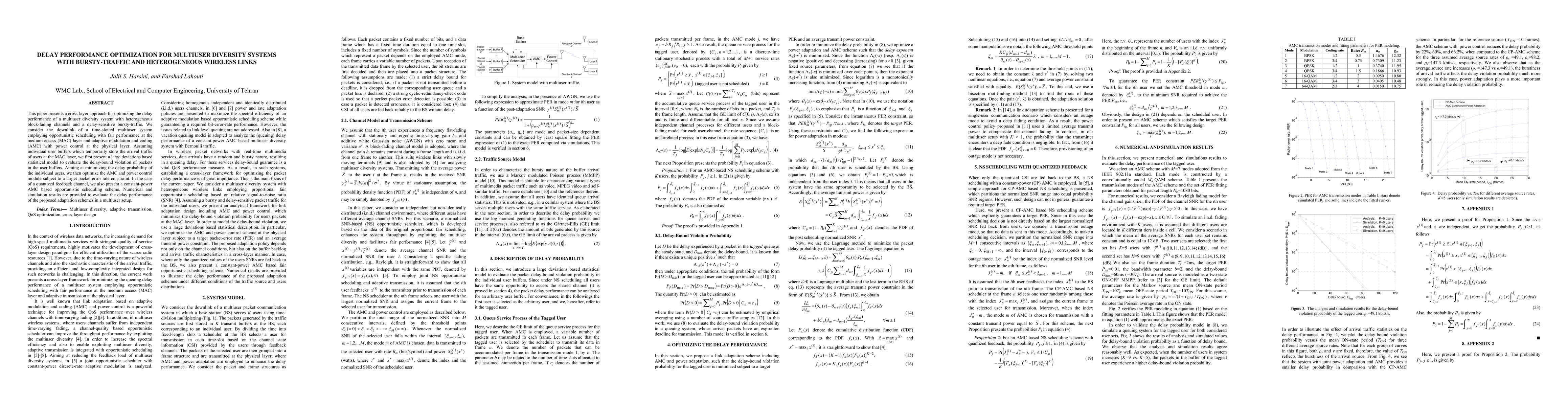 This paper optimizes delay performance in multiuser diversity systems with bursty traffic and heterogeneous wireless links using a cross-layer approach that combines opportunistic scheduling, adaptive modulation and coding, and power control. Numerical results demonstrate the effectiveness of the proposed schemes in minimizing delay probability under various conditions.