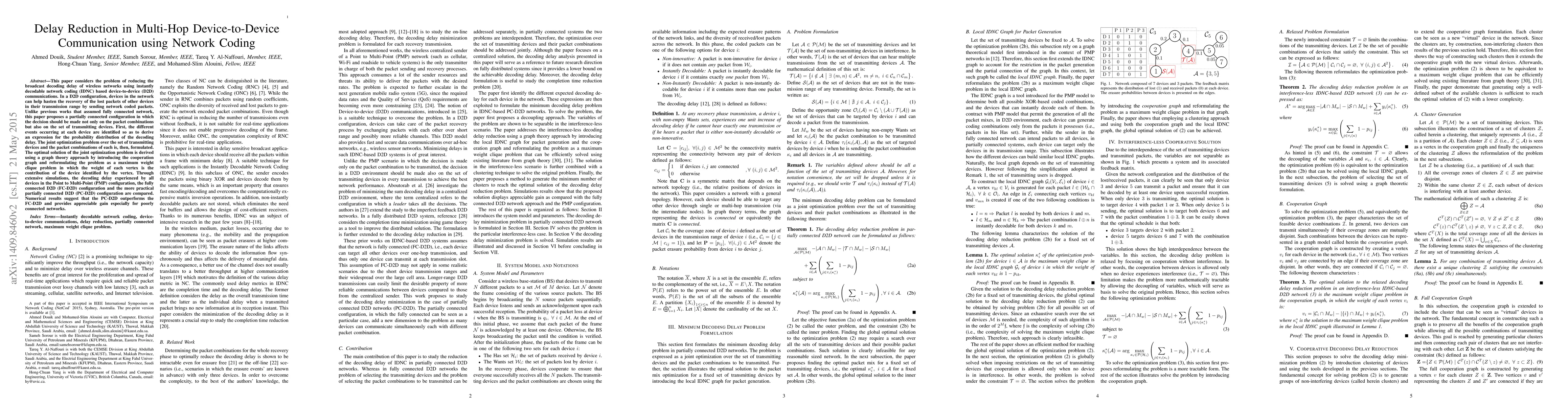 This paper considers the problem of reducing the broadcast decoding delay of wireless networks using instantly decodable network coding (IDNC) based device-to-device (D2D) communications. In a D2D configuration, devices in the network can help hasten the recovery of the lost packets of other devices in their transmission range by sending network coded packets. Unlike previous works that assumed fully connected network, this paper proposes a partially connected configuration in which the decision should be made not only on the packet combinations but also on the set of transmitting devices. First, the different events occurring at each device are identified so as to derive an expression for the probability distribution of the decoding delay. The joint optimization problem over the set of transmitting devices and the packet combinations of each is, then, formulated. The optimal solution of the joint optimization problem is derived using a graph theory approach by introducing the cooperation graph and reformulating the problem as a maximum weight clique problem in which the weight of each vertex is the contribution of the device identified by the vertex. Through extensive simulations, the decoding delay experienced by all devices in the Point to Multi-Point (PMP) configuration, the fully connected D2D (FC-D2D) configuration and the more practical partially connected D2D (PC-D2D) configuration are compared. Numerical results suggest that the PC-D2D outperforms the FC-D2D and provides appreciable gain especially for poorly connected networks.