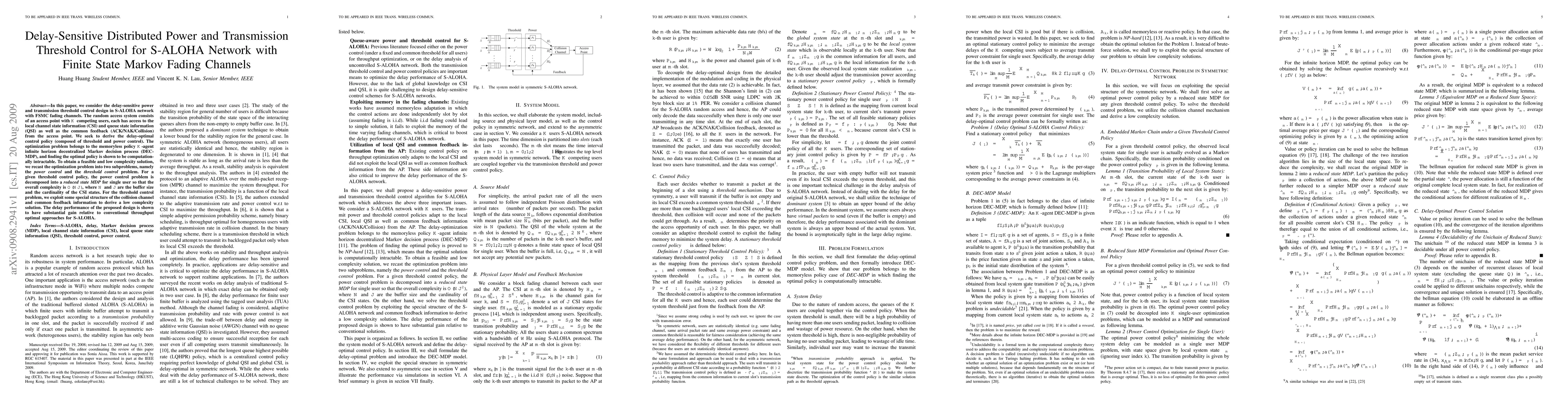 This paper proposes a delay-sensitive power and transmission threshold control strategy for S-ALOHA networks in finite state Markov fading channels. It decomposes the optimization problem into manageable subproblems to achieve a feasible solution with reduced complexity, demonstrating significant delay performance gains over traditional throughput-optimal methods.