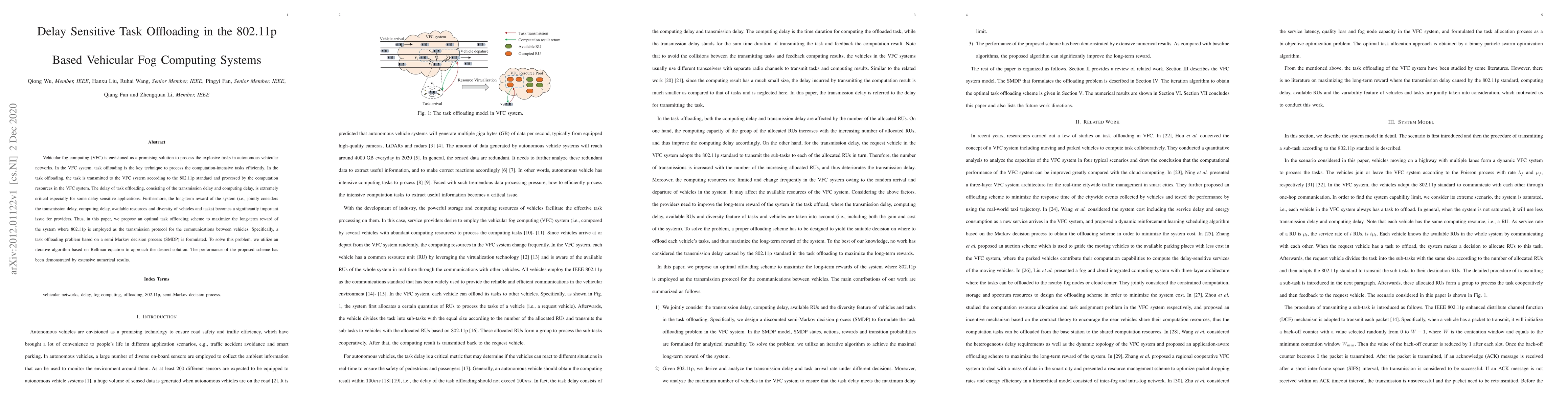 This paper proposes an optimal task offloading scheme for vehicular fog computing (VFC) systems based on the 802.11p standard to minimize delays and maximize long-term system rewards. It formulates the task offloading problem using a semi-Markov decision process and solves it with an iterative algorithm based on the Bellman equation.