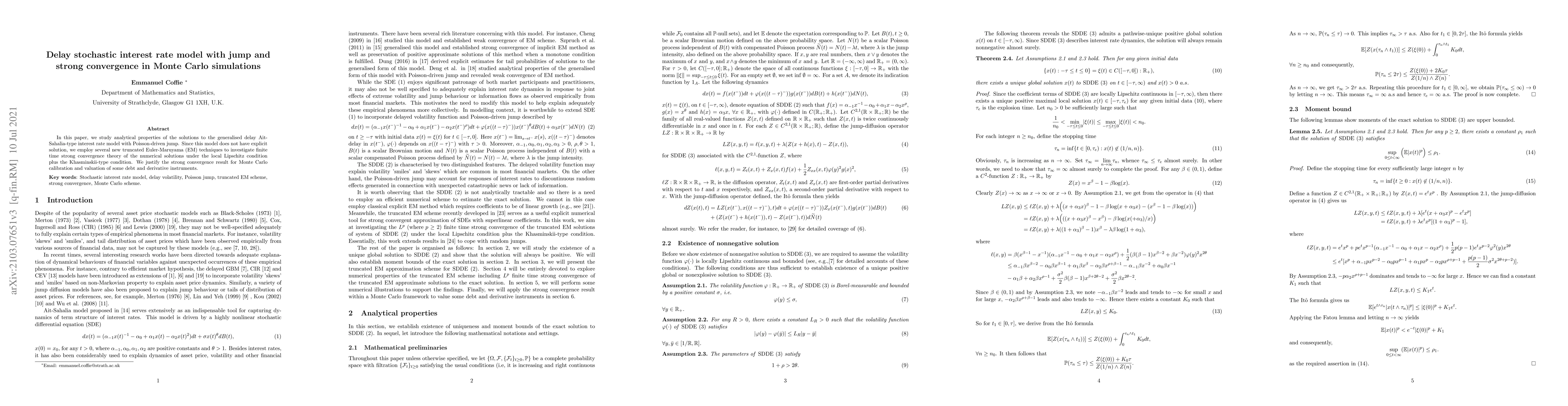 In this paper, we study analytical properties of the solutions to the generalised delay Ait-Sahalia-type interest rate model with Poisson-driven jump. Since this model does not have explicit solution, we employ several new truncated Euler-Maruyama (EM) techniques to investigate finite time strong convergence theory of the numerical solutions under the local Lipschitz condition plus the Khasminskii-type condition. We justify the strong convergence result for Monte Carlo calibration and valuation of some debt and derivative instruments.