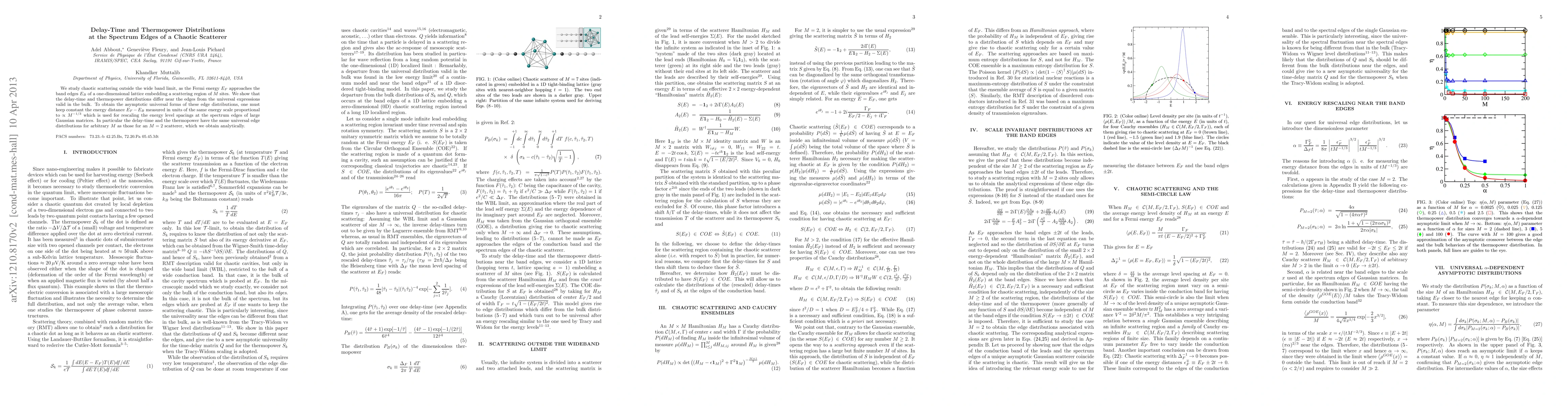 We study chaotic scattering outside the wide band limit, as the Fermi energy $E_F$ approaches the band edges $E_B$ of a one-dimensional lattice embedding a scattering region of M sites. We show that the delay-time and thermopower distributions differ near the edges from the universal expressions valid in the bulk. To obtain the asymptotic universal forms of these edge distributions, one must keep constant the energy distance $E_F-E_B$ measured in units of the same energy scale proportional to $\propto M^{-1/3}$ which is used for rescaling the energy level spacings at the spectrum edges of large Gaussian matrices. In particular the delay-time and the thermopower have the same universal edge distributions for arbitrary M as those for an M=2 scatterer, which we obtain analytically.