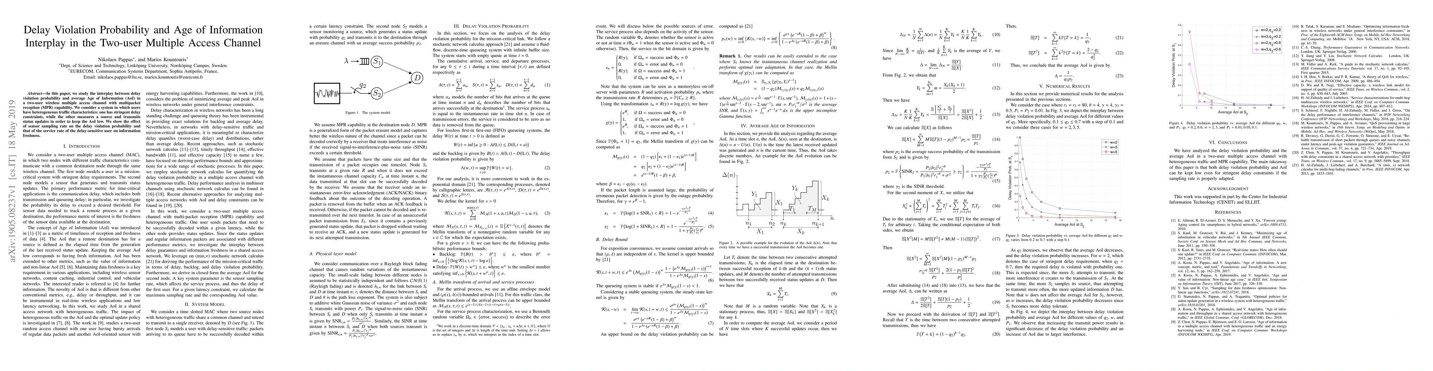 This paper investigates the relationship between delay violation probability and average Age of Information in a two-user multiple access channel with multipacket reception. It highlights how sensor sampling rate impacts delay violations and service rate affects information freshness, considering heterogeneous user traffic characteristics.