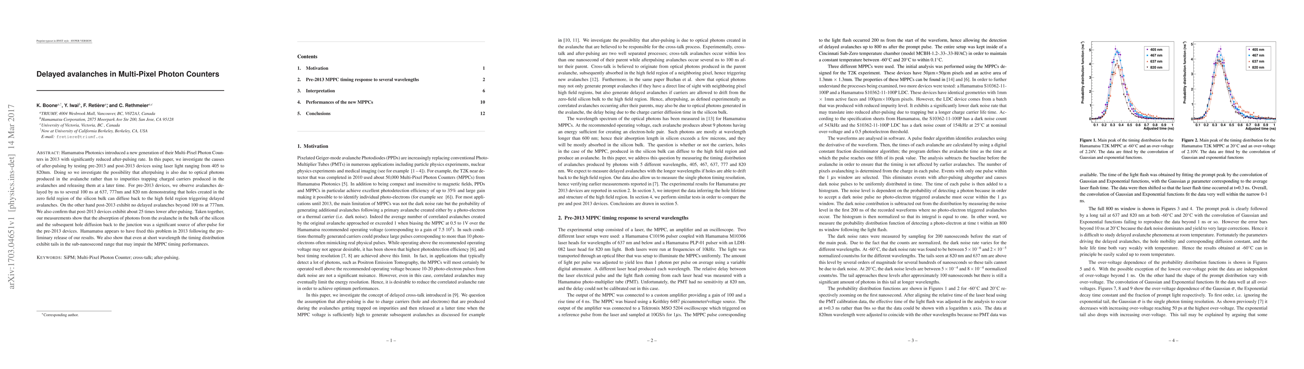 Hamamatsu Photonics introduced a new generation of their Multi-Pixel Photon Counters in 2013 with significantly reduced after-pulsing rate. In this paper, we investigate the causes of after-pulsing by testing pre-2013 and post-2013 devices using laser light ranging from 405 to 820nm. Doing so we investigate the possibility that afterpulsing is also due to optical photons produced in the avalanche rather than to impurities trapping charged carriers produced in the avalanches and releasing them at a later time. For pre-2013 devices, we observe avalanches delayed by ns to several 100~ns at 637, 777nm and 820 nm demonstrating that holes created in the zero field region of the silicon bulk can diffuse back to the high field region triggering delayed avalanches. On the other hand post-2013 exhibit no delayed avalanches beyond 100~ns at 777nm. We also confirm that post-2013 devices exhibit about 25 times lower after-pulsing. Taken together, our measurements show that the absorption of photons from the avalanche in the bulk of the silicon and the subsequent hole diffusion back to the junction was a significant source of after-pulse for the pre-2013 devices. Hamamatsu appears to have fixed this problem in 2013 following the preliminary release of our results. We also show that even at short wavelength the timing distribution exhibit tails in the sub-nanosecond range that may impair the MPPC timing performances.