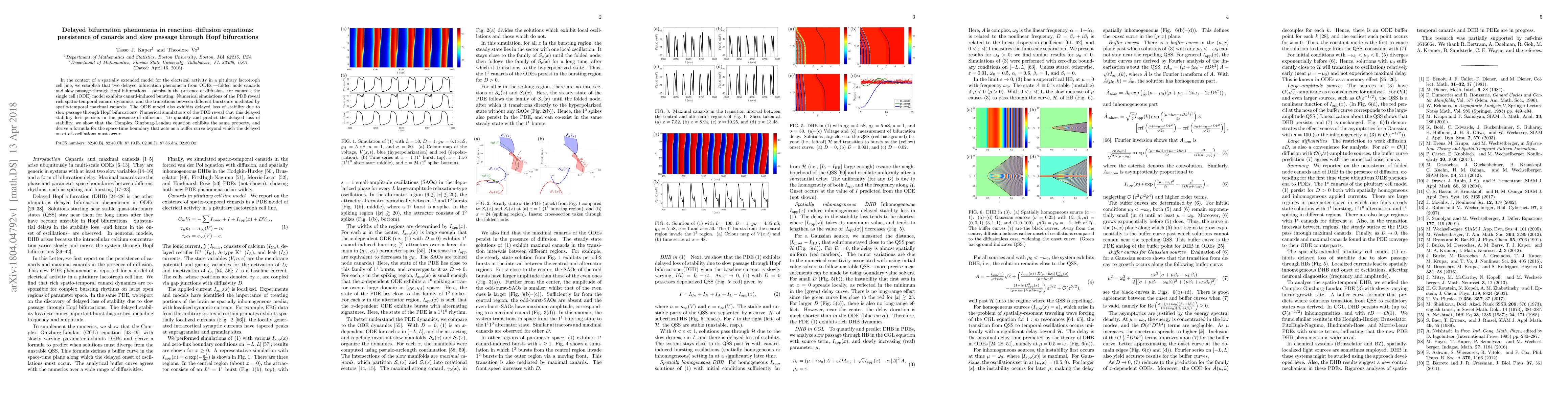In the context of a spatially extended model for the electrical activity in a pituitary lactotroph cell line, we establish that two delayed bifurcation phenomena from ODEs ---folded node canards and slow passage through Hopf bifurcations--- persist in the presence of diffusion. For canards, the single cell (ODE) model exhibits canard-induced bursting. Numerical simulations of the PDE reveal rich spatio-temporal canard dynamics, and the transitions between different bursts are mediated by spatio-temporal maximal canards. The ODE model also exhibits delayed loss of stability due to slow passage through Hopf bifurcations. Numerical simulations of the PDE reveal that this delayed stability loss persists in the presence of diffusion. To quantify and predict the delayed loss of stability, we show that the Complex Ginzburg-Landau equation exhibits the same property, and derive a formula for the space-time boundary that acts as a buffer curve beyond which the delayed onset of oscillations must occur.