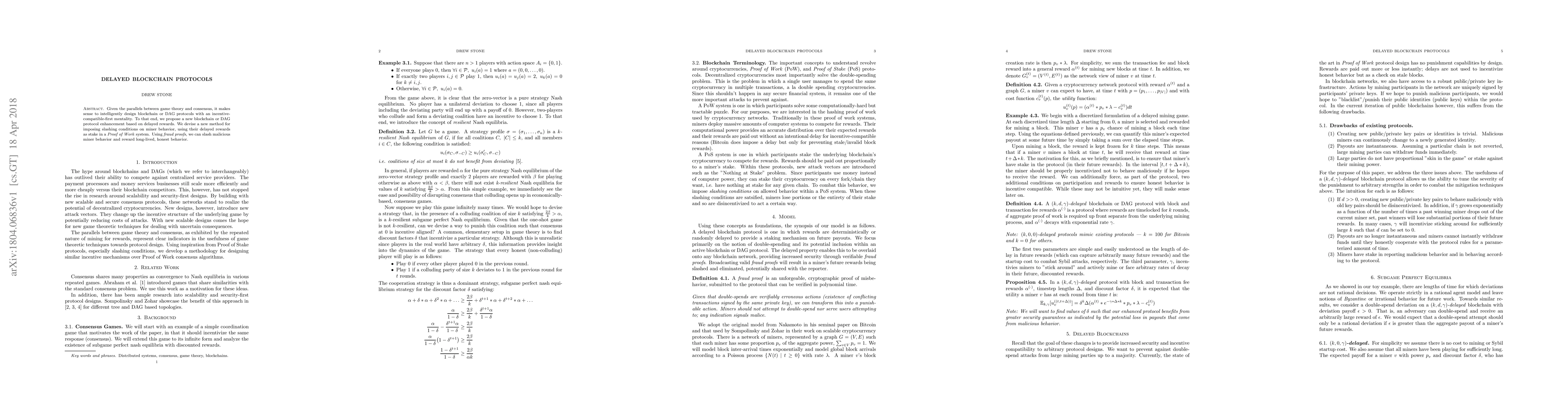 Given the parallels between game theory and consensus, it makes sense to intelligently design blockchain or DAG protocols with an incentive-compatible-first mentality. To that end, we propose a new blockchain or DAG protocol enhancement based on delayed rewards. We devise a new method for imposing slashing conditions on miner behavior, using their delayed rewards as stake in a Proof of Work system. Using fraud proofs, we can slash malicious miner behavior and reward long-lived, honest behavior.