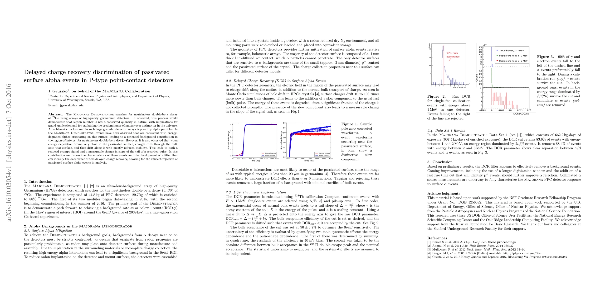The Majorana Demonstrator searches for neutrinoless double-beta decay of $^{76}$Ge using arrays of high-purity germanium detectors. If observed, this process would demonstrate that lepton number is not a conserved quantity in nature, with implications for grand-unification and for explaining the predominance of matter over antimatter in the universe. A problematic background in such large granular detector arrays is posed by alpha particles. In the Majorana Demonstrator, events have been observed that are consistent with energy- degraded alphas originating on the passivated surface, leading to a potential background contribution in the region-of-interest for neutrinoless double-beta decay. However, it is also observed that when energy deposition occurs very close to the passivated surface, charges drift through the bulk onto that surface, and then drift along it with greatly reduced mobility. This leads to both a reduced prompt signal and a measurable change in slope of the tail of a recorded pulse. In this contribution we discuss the characteristics of these events and the development of a filter that can identify the occurrence of this delayed charge recovery, allowing for the efficient rejection of passivated surface alpha events in analysis.