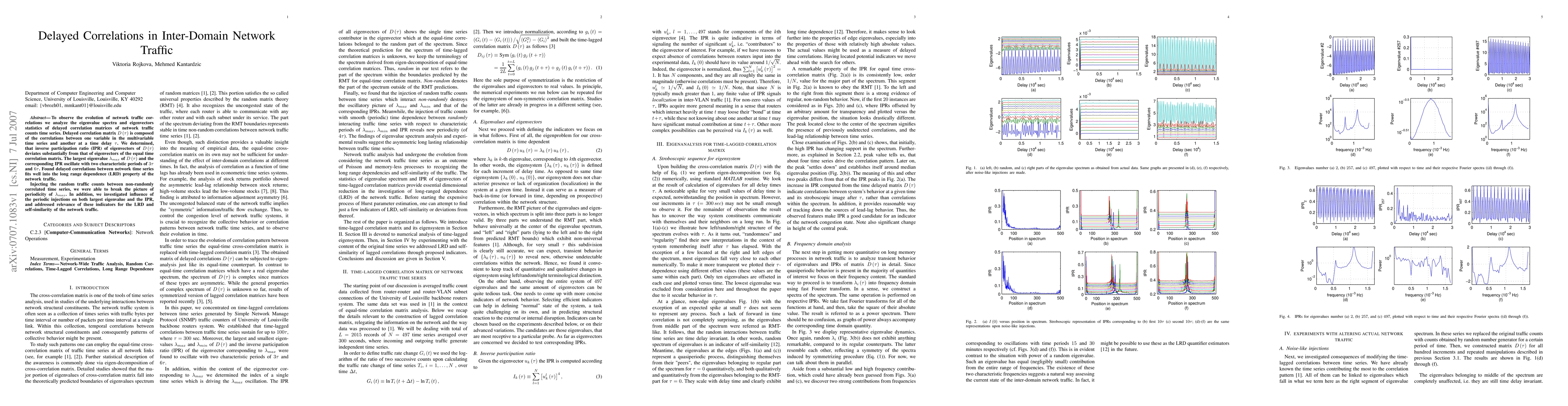 To observe the evolution of network traffic correlations we analyze the eigenvalue spectra and eigenvectors statistics of delayed correlation matrices of network traffic counts time series. Delayed correlation matrix D is composed of the correlations between one variable in the multivariable time series and another at a time delay \tau . Inverse participation ratio (IPR) of eigenvectors of D deviates substantially from the IPR of eigenvectors of the equal time correlation matrix C. We relate this finding to the localization and discuss its importance for network congestion control. The time-lagged correlation pattern between network time series is preserved over a long time, up to 100\tau, where \tau=300 sec. The largest eigenvalue \lambda_{max} of D and the corresponding IPR oscillate with two characteristic periods of 3\tau and 6\tau . The existence of delayed correlations between network time series fits well into the long range dependence (LRD) property of the network traffic. The ability to monitor and control the long memory processes is crucial since they impact the network performance. Injecting the random traffic counts between non-randomly correlated time series, we were able to break the picture of periodicity of \lambda_{max}. In addition, we investigated influence of the periodic injections on both largest eigenvalue and the IPR, and addressed relevance of these indicators for the LRD and self-similarity of the network traffic.