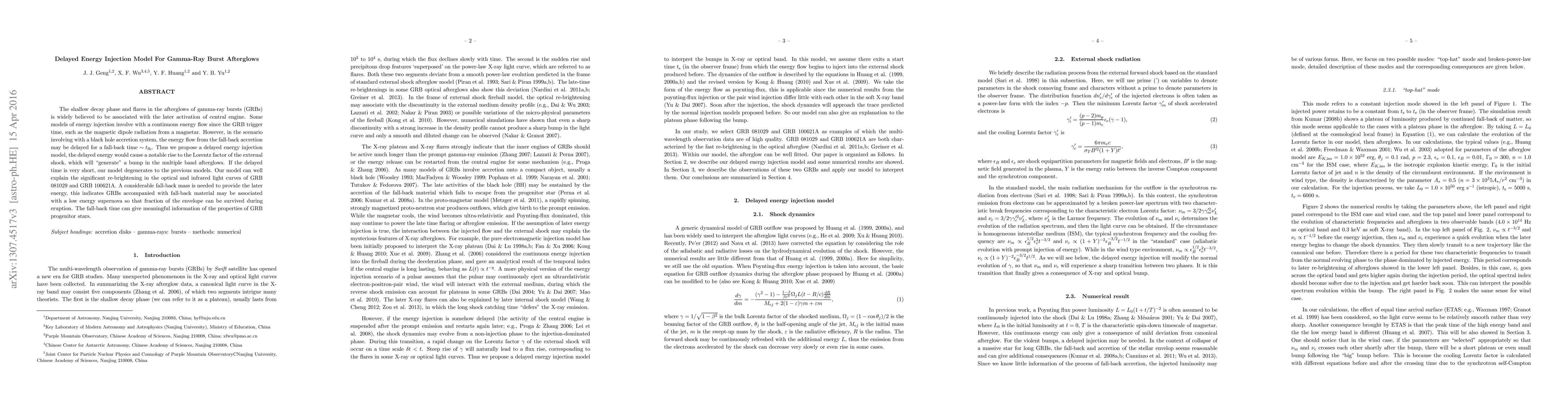 The shallow decay phase and flares in the afterglows of gamma-ray bursts (GRBs) is widely believed to be associated with the later activation of central engine. Some models of energy injection involve with a continuous energy flow since the GRB trigger time, such as the magnetic dipole radiation from a magnetar. However, in the scenario involving with a black hole accretion system, the energy flow from the fall-back accretion may be delayed for a fall-back time $\sim t_{\rm fb}$. Thus we propose a delayed energy injection model, the delayed energy would cause a notable rise to the Lorentz factor of the external shock, which will "generate" a bump in the multiple band afterglows. If the delayed time is very short, our model degenerates to the previous models. Our model can well explain the significant re-brightening in the optical and infrared light curves of GRB 081029 and GRB 100621A. A considerable fall-back mass is needed to provide the later energy, this indicates GRBs accompanied with fall-back material may be associated with a low energy supernova so that fraction of the envelope can be survived during eruption. The fall-back time can give meaningful information of the properties of GRB progenitor stars.