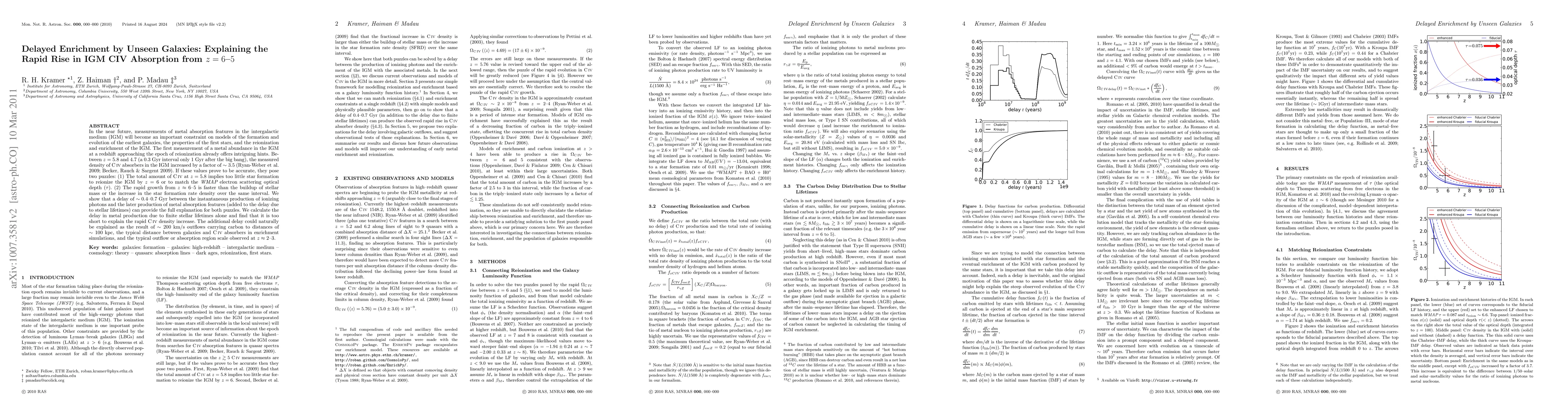 This paper investigates the rapid rise in CIV absorption between z=6-5, suggesting a delayed enrichment of the intergalactic medium (IGM) by unseen galaxies. The authors propose that a delay of ~0.4-0.7 Gyr between ionizing photon production and metal absorption feature formation, due to outflows carrying carbon to distances between galaxies, can explain the observed increase in CIV density.