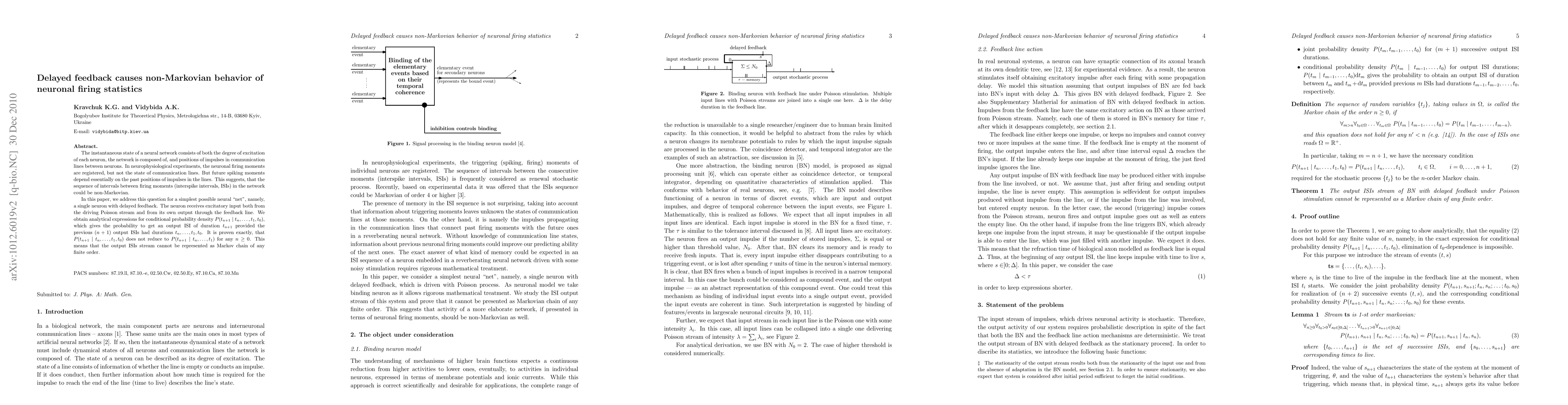 The instantaneous state of a neural network consists of both the degree of excitation of each neuron, the network is composed of, and positions of impulses in communication lines between neurons. In neurophysiological experiments, the neuronal firing moments are registered, but not the state of communication lines. But future spiking moments depend essentially on the past positions of impulses in the lines. This suggests, that the sequence of intervals between firing moments (interspike intervals, ISIs) in the network could be non-Markovian. In this paper, we address this question for a simplest possible neural "net", namely, a single neuron with delayed feedback. The neuron receives excitatory input both from the driving Poisson stream and from its own output through the feedback line. We obtain analytical expressions for conditional probability density $P(t_{n+1} | t_n,...,t_1,t_0)$, which gives the probability to get an output ISI of duration $t_{n+1}$ provided the previous $(n+1)$ output ISIs had durations $t_n,...,t_1,t_0$. It is proven exactly, that $P(t_{n+1} | t_n,...,t_1,t_0)$ does not reduce to $P(t_{n+1} | t_n,...,t_1)$ for any $n \geq 0$. This means that the output ISIs stream cannot be represented as Markov chain of any finite order.