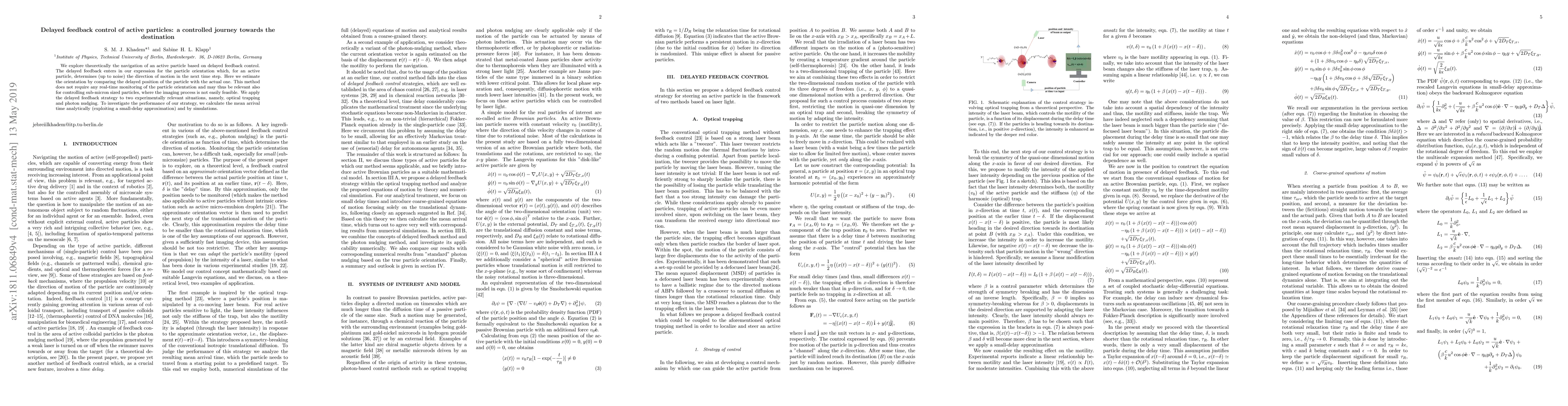 This paper theoretically investigates the navigation of active particles using delayed feedback control, estimating particle orientation by comparing delayed and actual positions. This method, which does not require real-time monitoring, is applied to optical trapping and photon nudging, with performance evaluated analytically and via simulations.