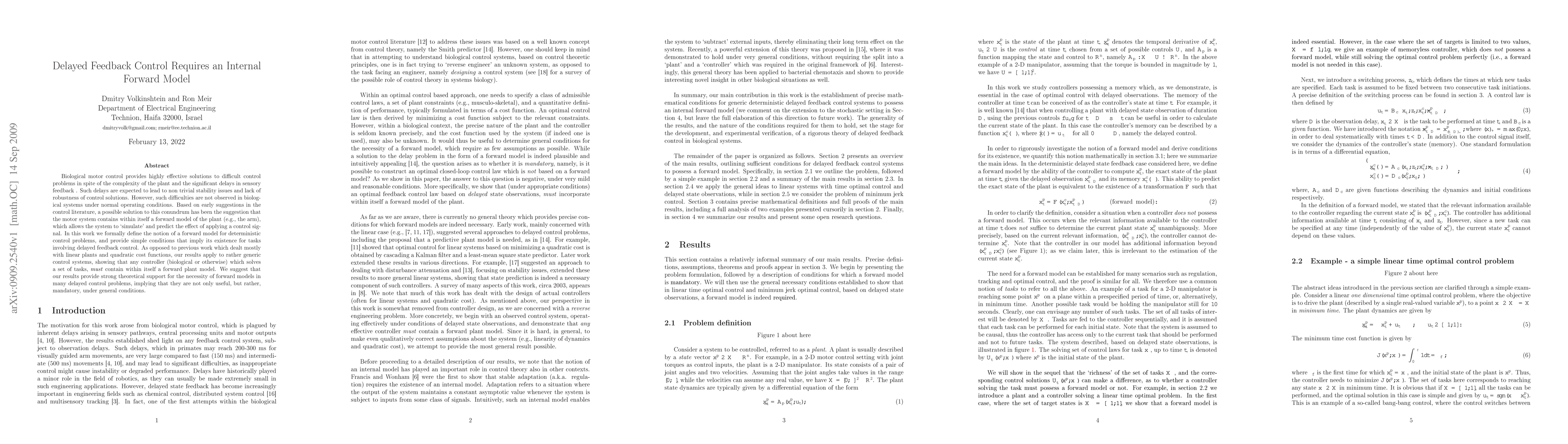 This paper argues that effective biological motor control relies on the presence of an internal forward model to predict the effects of control actions despite significant delays in sensory feedback. It formally defines the concept and shows that such models are necessary for solving a wide range of control tasks, not just linear systems.