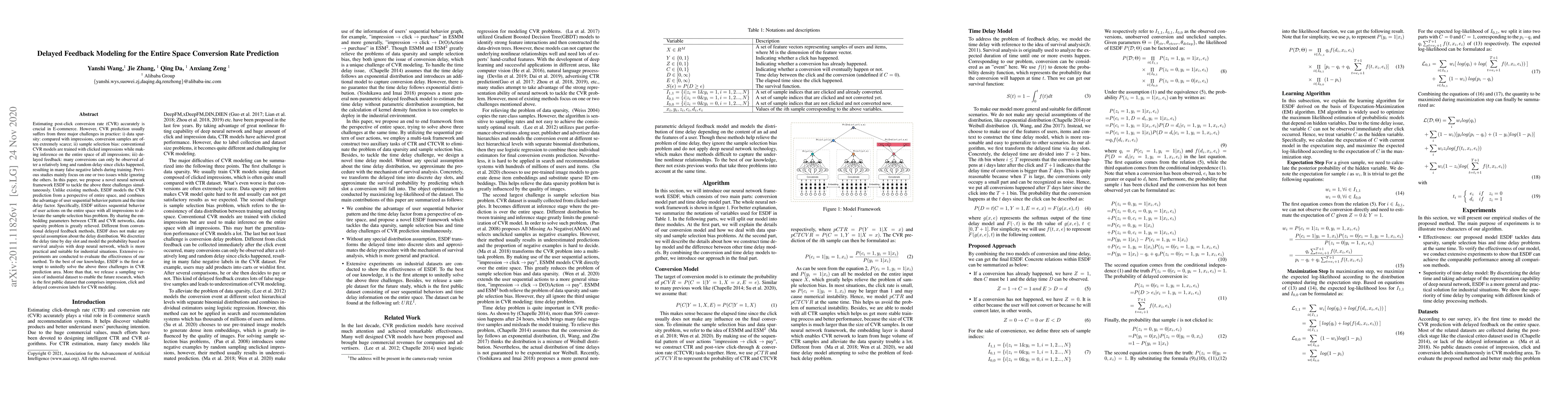 This paper introduces ESDF, a novel neural network framework for predicting post-click conversion rates in E-commerce, addressing data sparsity, sample selection bias, and delayed feedback. ESDF models user sequential behavior across all impressions and discretizes delay time using survival analysis, offering a practical solution for industrial applications.