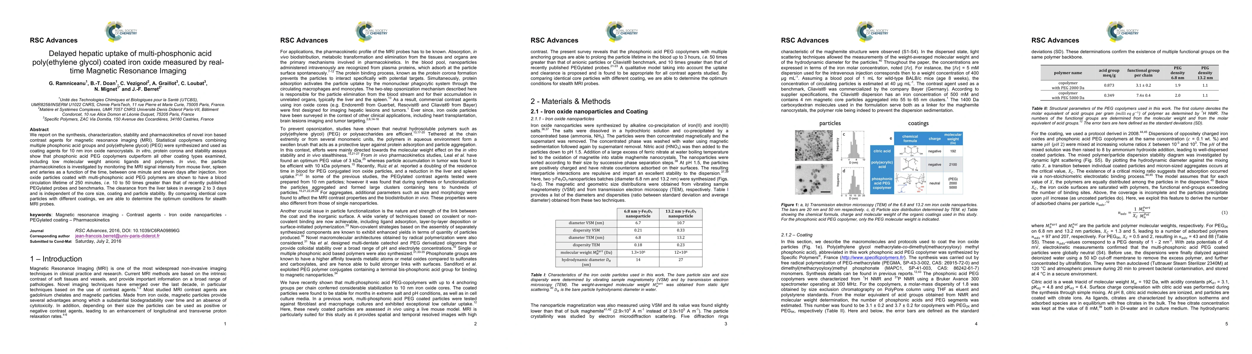 This paper details the synthesis and characterization of novel iron oxide nanoparticles coated with phosphonic acid poly(ethylene glycol) copolymers for MRI, showing enhanced stability and prolonged blood circulation. The pharmacokinetics reveal delayed hepatic uptake and clearance over 2 to 3 days, optimizing stealth MRI contrast agents.