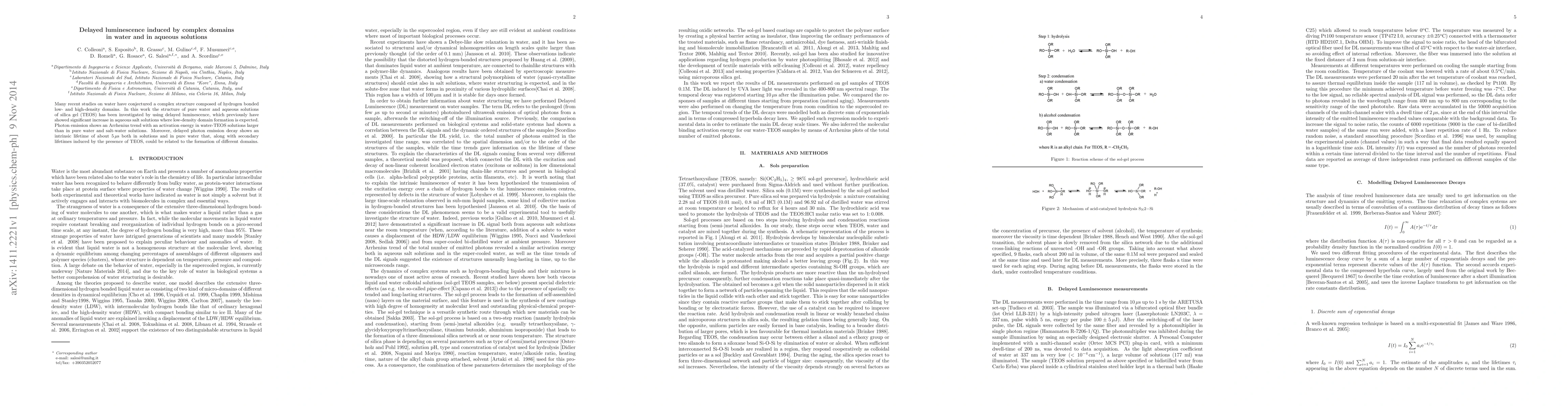 This study investigates the complex structure of pure water and silica gel (TEOS) solutions using delayed luminescence, revealing an Arrhenius trend with higher activation energy in water-TEOS mixtures. The intrinsic 5-microsecond lifetime of photon emission suggests the presence of distinct domains, with secondary lifetimes linked to TEOS-induced domain formation.