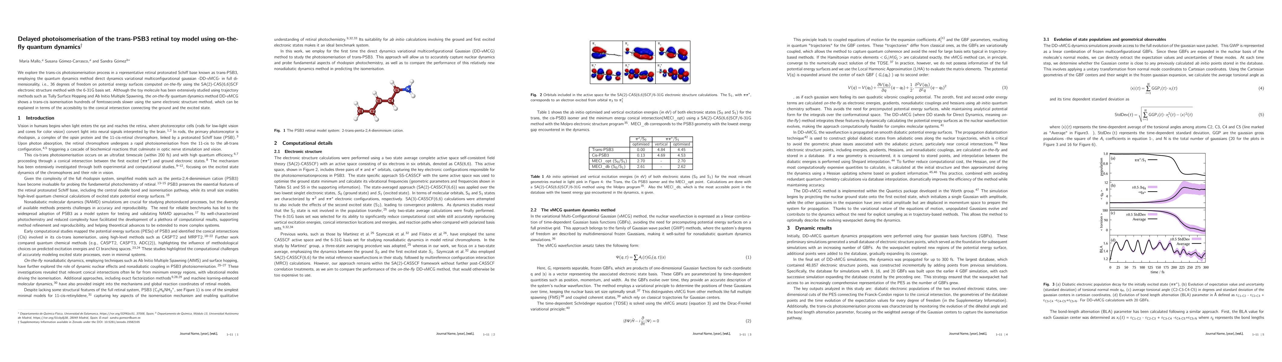 The study employs the quantum dynamics method direct dynamics variational multiconfigurational gaussian (DD-vMCG) in full dimensionality (36 degrees of freedom) on potential energy surfaces computed on-the-fly using the SA(2)-CAS(6,6)SCF electronic structure method with the 6-31G basis set to investigate the trans-cis photoisomerisation process in the trans-PSB3 retinal toy model.