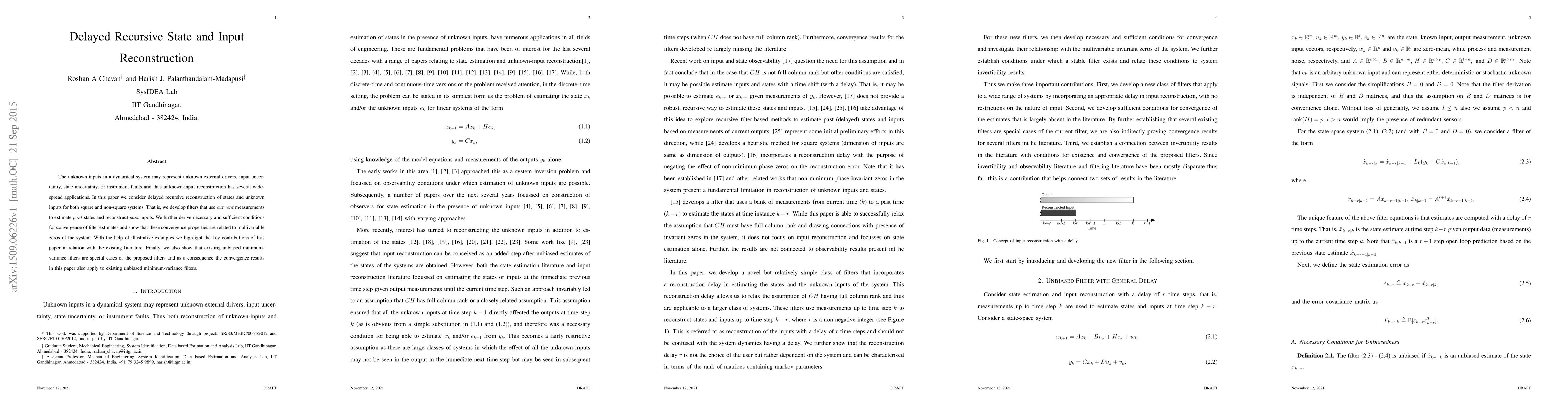 The unknown inputs in a dynamical system may represent unknown external drivers, input uncertainty, state uncertainty, or instrument faults and thus unknown-input reconstruction has several wide-spread applications. In this paper we consider delayed recursive reconstruction of states and unknown inputs for both square and non-square systems. That is, we develop filters that use current measurements to estimate past states and reconstruct past inputs. We further derive necessary and sufficient conditions for convergence of filter estimates and show that these convergence properties are related to multivariable zeros of the system. With the help of illustrative examples we highlight the key contributions of this paper in relation with the existing literature. Finally, we also show that existing unbiased minimum-variance filters are special cases of the proposed filters and as a consequence the convergence results in this paper also apply to existing unbiased minimum-variance filters.