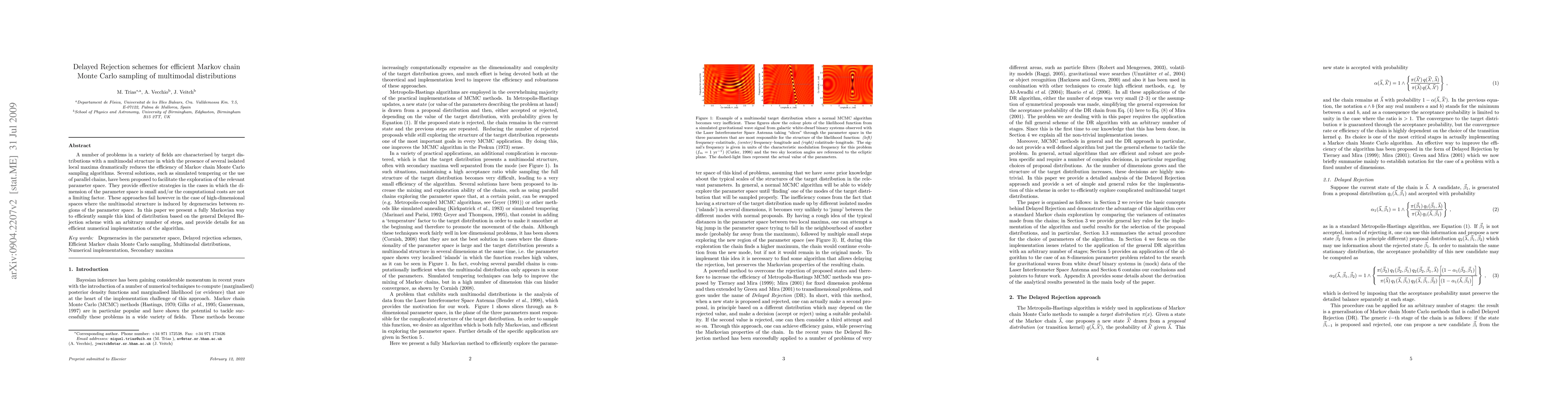 This paper proposes a Delayed Rejection scheme for efficient Markov Chain Monte-Carlo sampling of multimodal distributions, addressing the inefficiency of traditional methods in high-dimensional spaces. The method provides a fully Markovian approach to explore the parameter space effectively, even when computational costs are significant.