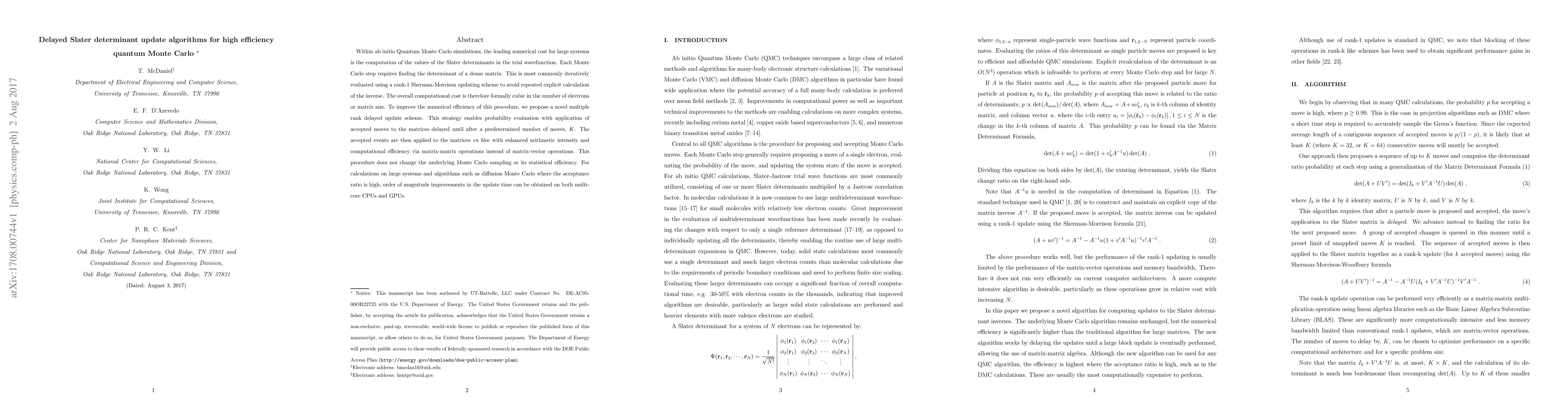 This paper proposes a novel multiple rank delayed update scheme to improve the efficiency of Slater determinant computations in Quantum Monte Carlo simulations, significantly reducing update time through matrix-matrix operations instead of matrix-vector operations, without affecting statistical efficiency. This method achieves substantial performance gains for large systems and high acceptance ratios.