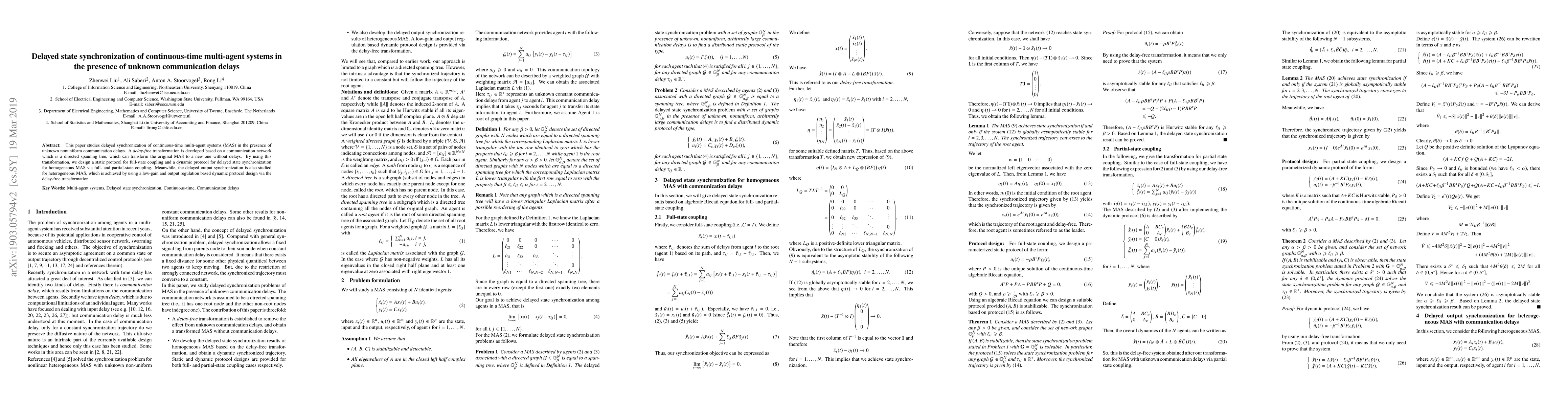 This paper investigates the delayed synchronization of continuous-time multi-agent systems with unknown communication delays, developing a delay-free transformation based on a directed spanning tree. It designs static and dynamic protocols for full-state and delayed state synchronization, including a low-gain protocol for delayed output synchronization in heterogeneous systems.