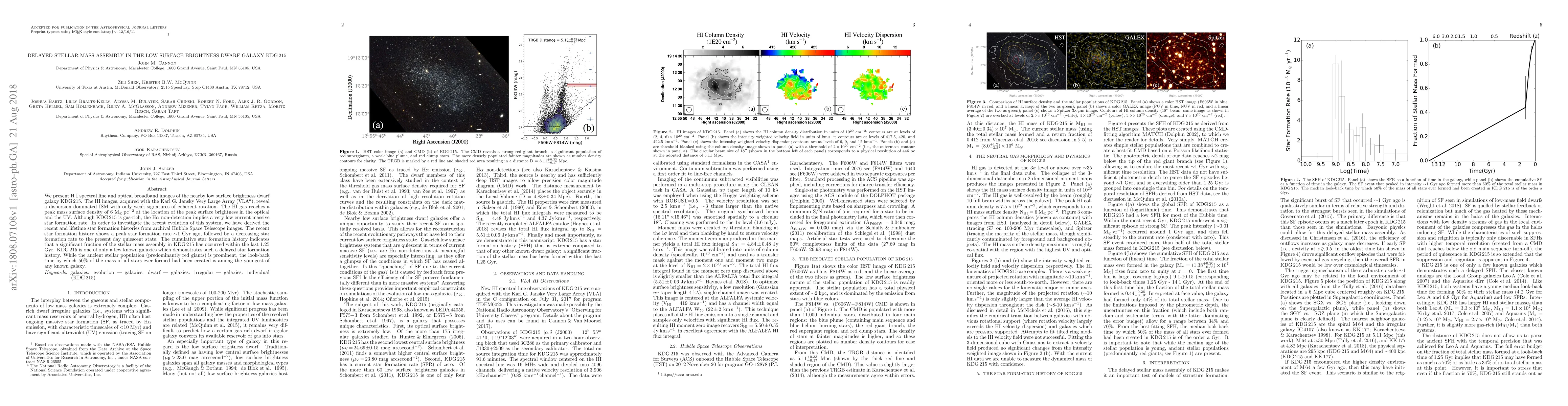 The study of low surface brightness dwarf galaxy KDG215, using VLA HI images and Hubble Space Telescope data, reveals a dispersion-dominated ISM with weak rotation, and a recent peak in star formation about 1 Gyr ago, indicating a delayed stellar mass assembly within the last 1.25 Gyr, making KDG215 one of the few galaxies with such a history.