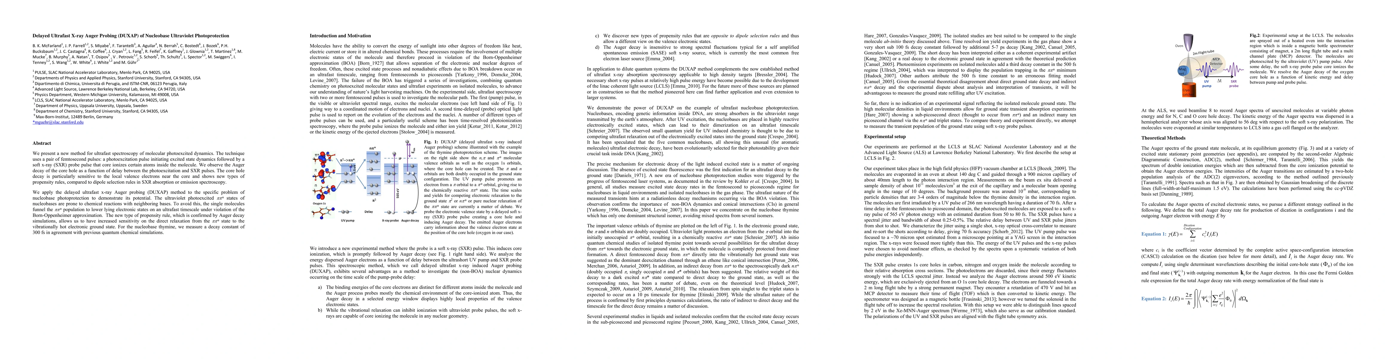 We present a new method for ultrafast spectroscopy of molecular photoexcited dynamics. The technique uses a pair of femtosecond pulses: a photoexcitation pulse initiating excited state dynamics followed by a soft x-ray (SXR) probe pulse that core ionizes certain atoms inside the molecule. We observe the Auger decay of the core hole as a function of delay between the photoexcitation and SXR pulses. The core hole decay is particularly sensitive to the local valence electrons near the core and shows new types of propensity rules, compared to dipole selection rules in SXR absorption or emission spectroscopy. We apply the delayed ultrafast x-ray Auger probing (DUXAP) method to the specific problem of nucleobase photoprotection to demonstrate its potential. The ultraviolet photoexcited \pi\pi* states of nucleobases are prone to chemical reactions with neighboring bases. To avoid this, the single molecules funnel the \pi\pi* population to lower lying electronic states on an ultrafast timescale under violation of the Born-Oppenheimer approximation. The new type of propensity rule, which is confirmed by Auger decay simulations, allows us to have increased sensitivity on the direct relaxation from the \pi\pi* state to the vibrationally hot electronic ground state. For the nucleobase thymine, we measure a decay constant of 300 fs in agreement with previous quantum chemical simulations.