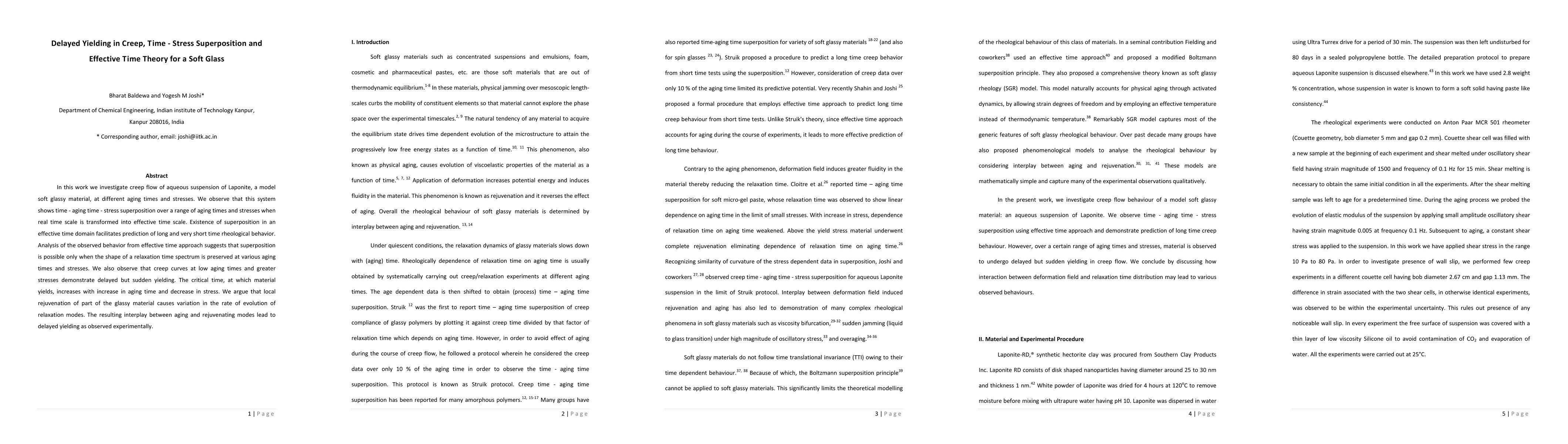In this work we investigate creep flow of aqueous suspension of Laponite, a model soft glassy material, at different aging times and stresses. We observe that this system shows time - aging time - stress superposition over a range of aging times and stresses when real time scale is transformed into effective time scale. Existence of superposition in an effective time domain facilitates prediction of long and very short time rheological behavior. Analysis of the observed behavior from effective time approach suggests that superposition is possible only when the shape of a relaxation time spectrum is preserved at various aging times and stresses. We also observe that creep curves at low aging times and greater stresses demonstrate delayed but sudden yielding. The critical time, at which material yields, increases with increase in aging time and decrease in stress. We argue that local rejuvenation of part of the glassy material causes variation in the rate of evolution of relaxation modes. The resulting interplay between aging and rejuvenating modes lead to delayed yielding as observed experimentally.