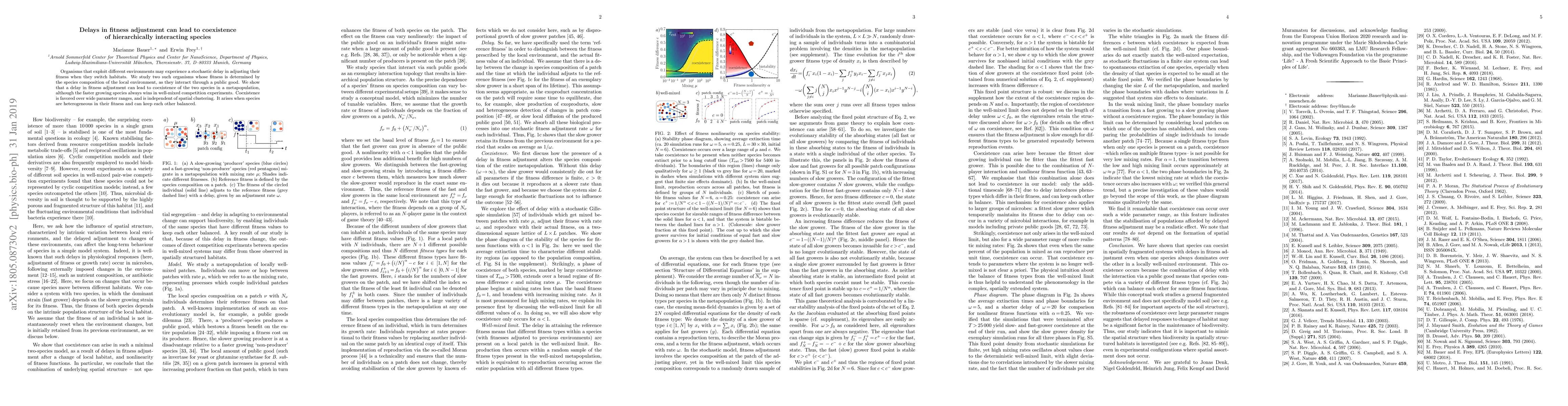This paper explores how delays in fitness adjustment between two hierarchically interacting species can lead to their coexistence in a metapopulation, despite the faster-growing species dominating in well-mixed environments. Coexistence is favored across a broad range of parameters and is not dependent on spatial clustering.