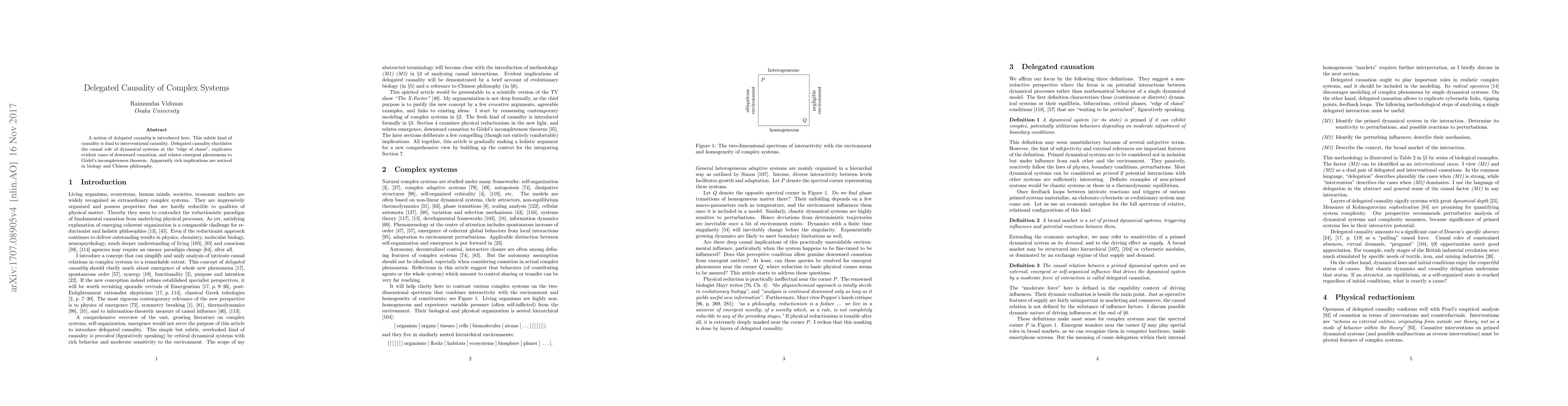 This paper introduces delegated causality, a concept dual to interventional causality, which helps explain the causal roles in complex systems near chaos, elucidates downward causation, and connects emergent phenomena to Gödel's incompleteness theorem, with notable implications in biology and Chinese philosophy.
