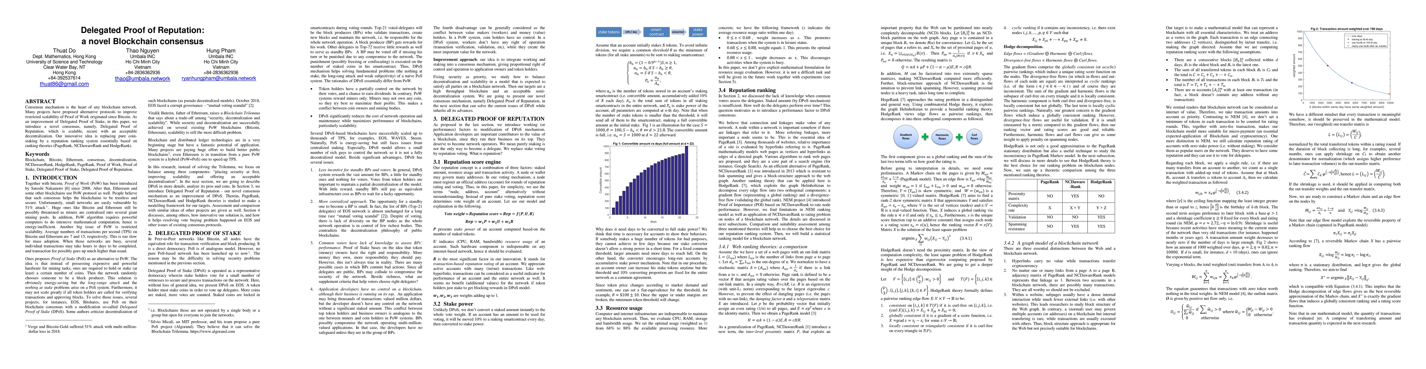 Consensus mechanism is the heart of any blockchain network. Many projects have proposed alternative protocols to improve restricted scalability of Proof of Work originated since Bitcoin. As an improvement of Delegated Proof of Stake, in this paper, we introduce a novel consensus, namely, Delegated Proof of Reputation, which is scalable, secure with an acceptable decentralization. Our innovative idea is replacing pure coinstaking by a reputation ranking system essentially based on ranking theories (PageRank, NCDawareRank and HodgeRank).