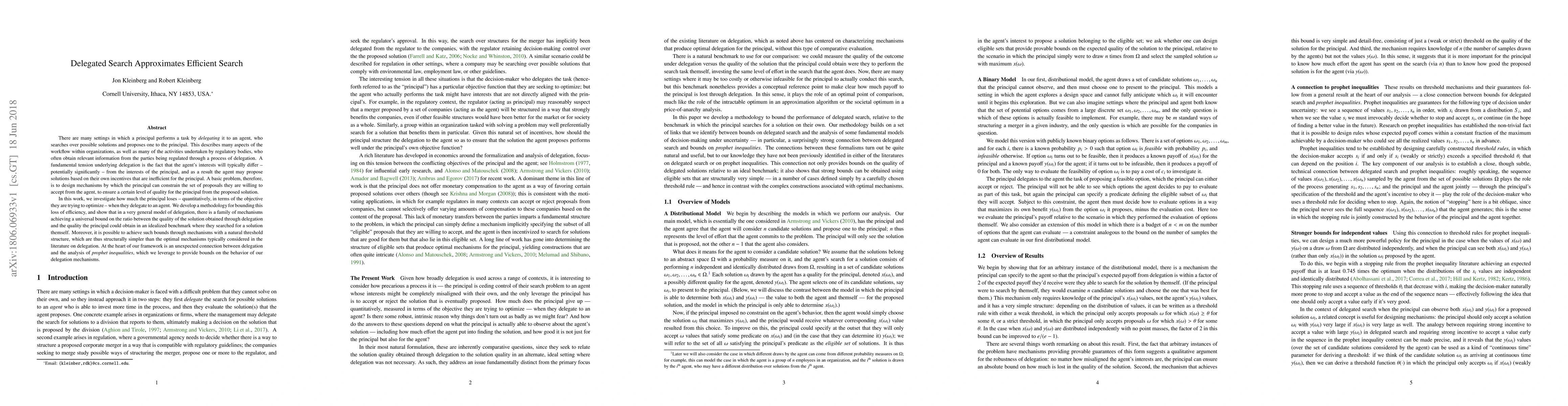 There are many settings in which a principal performs a task by delegating it to an agent, who searches over possible solutions and proposes one to the principal. This describes many aspects of the workflow within organizations, as well as many of the activities undertaken by regulatory bodies, who often obtain relevant information from the parties being regulated through a process of delegation. A fundamental tension underlying delegation is the fact that the agent's interests will typically differ -- potentially significantly -- from the interests of the principal, and as a result the agent may propose solutions based on their own incentives that are inefficient for the principal. A basic problem, therefore, is to design mechanisms by which the principal can constrain the set of proposals they are willing to accept from the agent, to ensure a certain level of quality for the principal from the proposed solution. In this work, we investigate how much the principal loses -- quantitatively, in terms of the objective they are trying to optimize -- when they delegate to an agent. We develop a methodology for bounding this loss of efficiency, and show that in a very general model of delegation, there is a family of mechanisms achieving a universal bound on the ratio between the quality of the solution obtained through delegation and the quality the principal could obtain in an idealized benchmark where they searched for a solution themself. Moreover, it is possible to achieve such bounds through mechanisms with a natural threshold structure, which are thus structurally simpler than the optimal mechanisms typically considered in the literature on delegation. At the heart of our framework is an unexpected connection between delegation and the analysis of prophet inequalities, which we leverage to provide bounds on the behavior of our delegation mechanisms.
