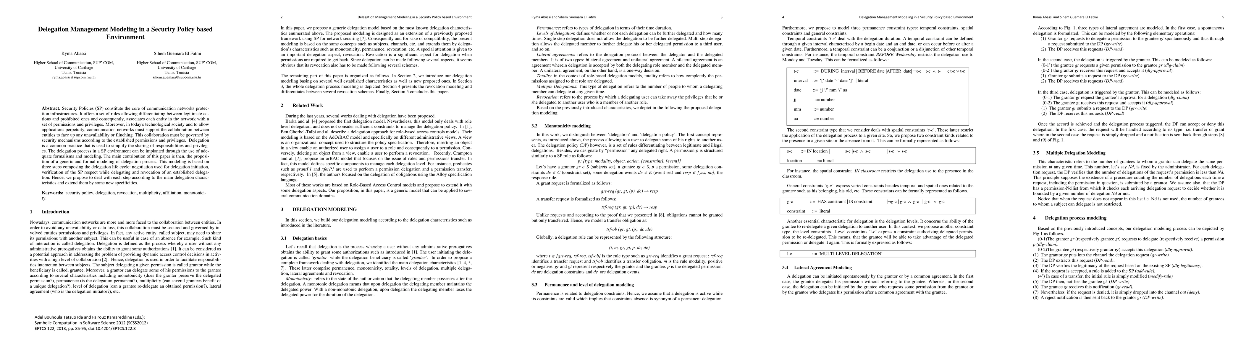 This paper proposes a formal modeling of the delegation process within a Security Policy environment, focusing on three key steps: delegation initiation through negotiation, verification of policy compliance, and revocation of delegation. The model aims to enhance collaboration while maintaining security integrity.