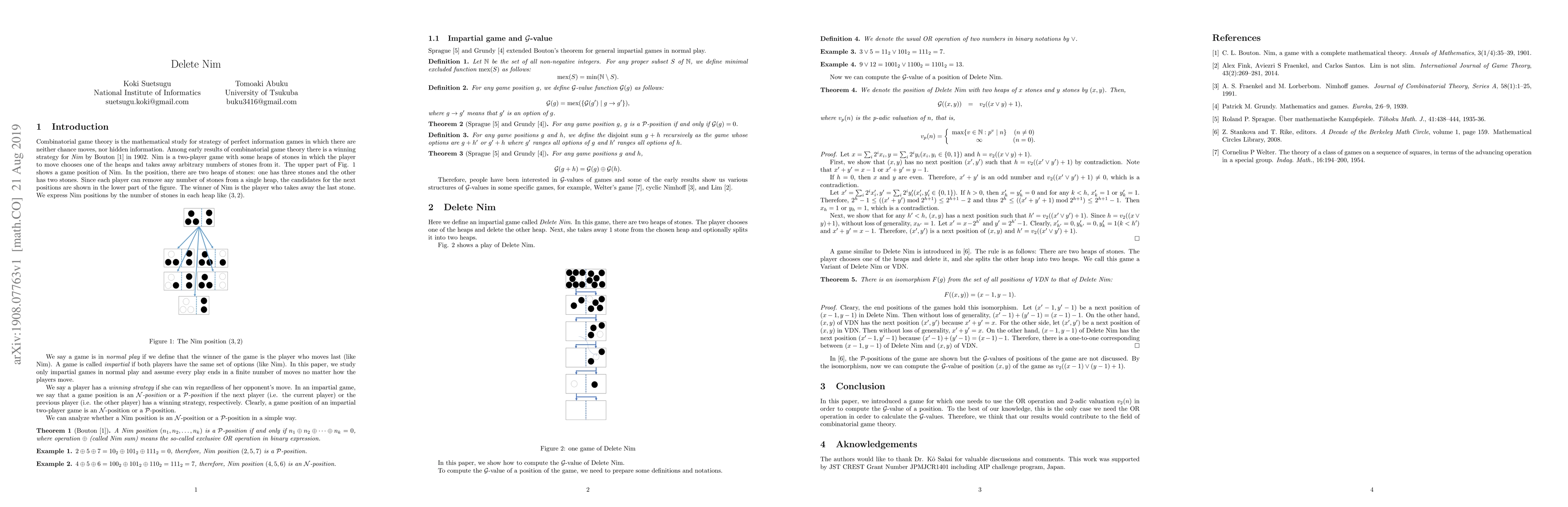 This paper investigates the impartial game Delete Nim, where players choose a heap to delete the other and optionally split stones. It presents a method for calculating the G-value using the OR operation and 2-adic valuation.