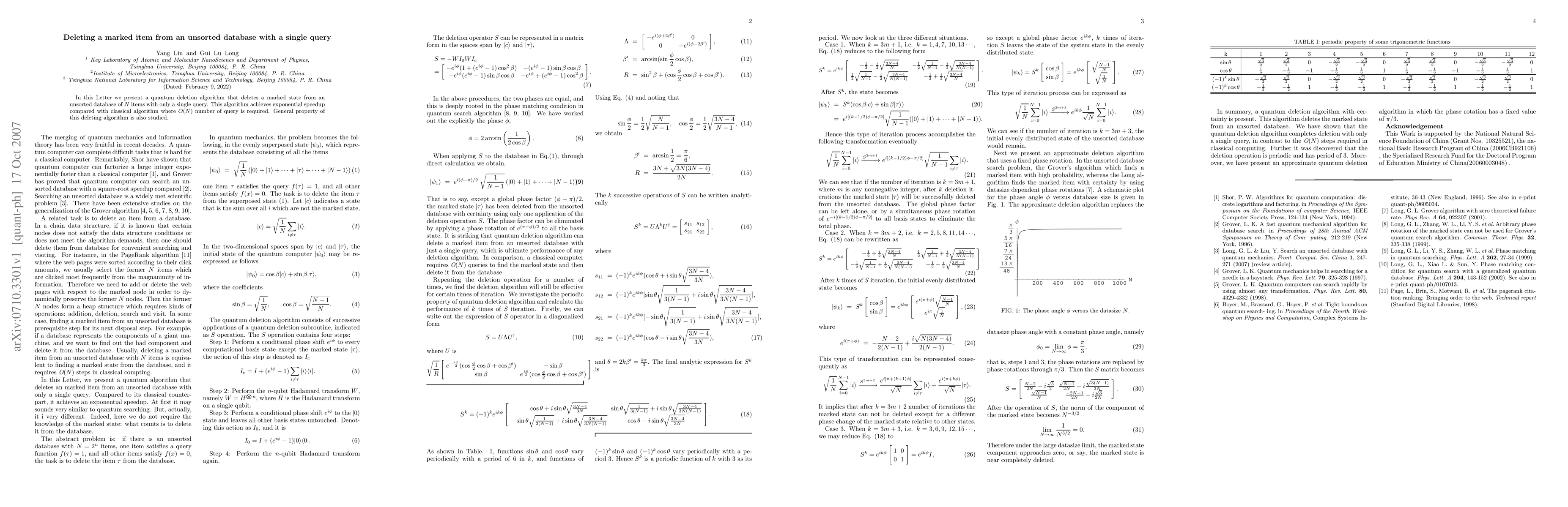 Summary: This paper introduces a quantum algorithm that deletes a marked item from an unsorted database with a single query, achieving exponential speedup over classical methods requiring O(N) queries. The general properties of this quantum deletion algorithm are also explored.