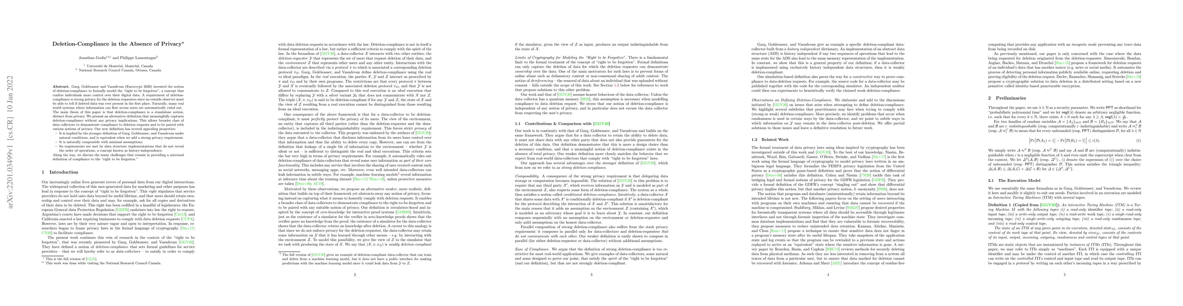 Garg, Goldwasser and Vasudevan (Eurocrypt 2020) invented the notion of deletion-compliance to formally model the "right to be forgotten", a concept that confers individuals more control over their digital data. A requirement of deletion-compliance is strong privacy for the deletion requesters since no outside observer must be able to tell if deleted data was ever present in the first place. Naturally, many real world systems where information can flow across users are automatically ruled out. The main thesis of this paper is that deletion-compliance is a standalone notion, distinct from privacy. We present an alternative definition that meaningfully captures deletion-compliance without any privacy implications. This allows broader class of data collectors to demonstrate compliance to deletion requests and to be paired with various notions of privacy. Our new definition has several appealing properties: - It is implied by the stronger definition of Garg et al. under natural conditions, and is equivalent when we add a privacy requirement. - It is naturally composable with minimal assumptions. - Its requirements are met by data structure implementations that do not reveal the order of operations, a concept known as history-independence. Along the way, we discuss the many challenges that remain in providing a universal definition of compliance to the "right to be forgotten."