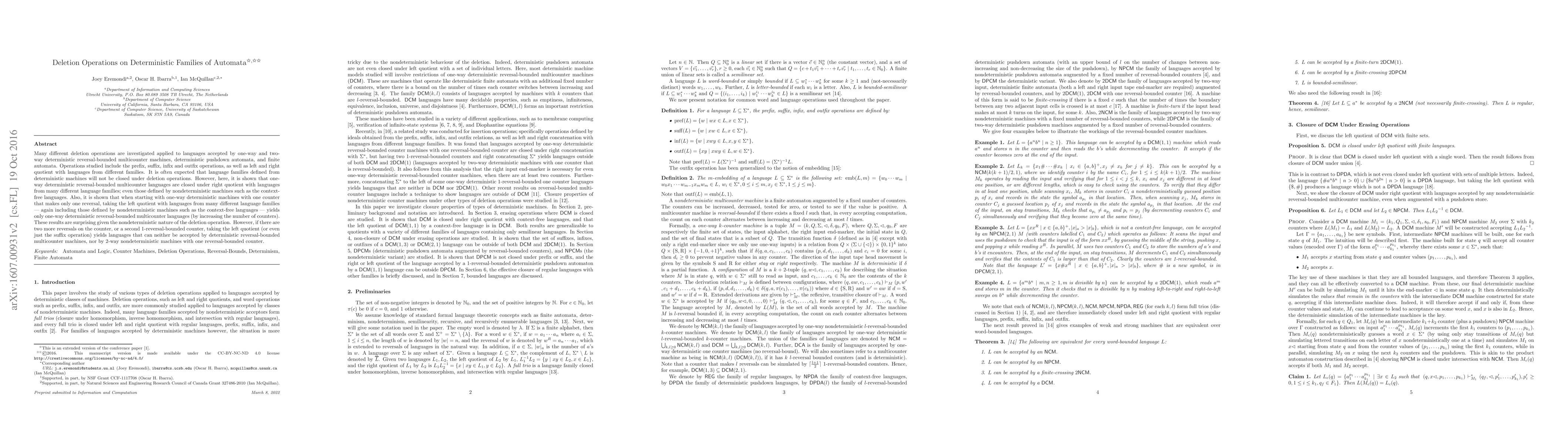 This paper investigates various deletion operations on languages accepted by deterministic automata, finding that one-way deterministic reversal-bounded multicounter languages are closed under right quotient with many language families, including context-free languages. Additionally, left quotients with similar languages maintain the same deterministic machine structure, but more reversals result in languages outside the deterministic machine acceptance class.