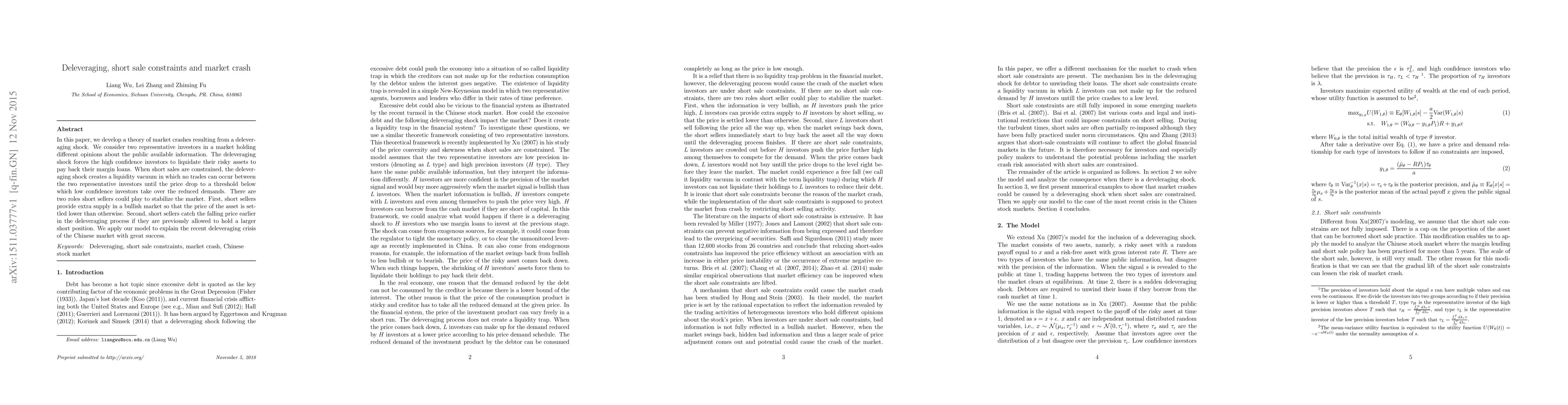 This paper develops a theory explaining market crashes due to deleveraging shocks, where high-confidence investors liquidate assets to meet margin loans, creating a liquidity vacuum when short sales are constrained. Short sellers play a stabilizing role by providing extra supply and catching falling prices earlier, and the model successfully explains the Chinese market's deleveraging crisis.