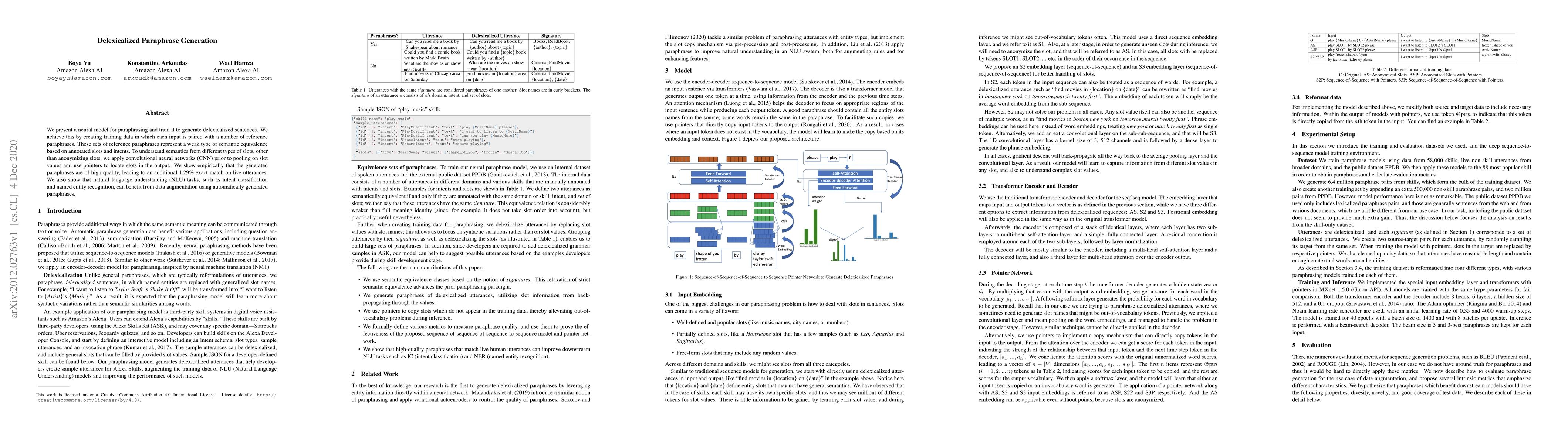 This paper introduces a neural model for generating delexicalized paraphrases by training on data annotated with semantic equivalences based on slots and intents. The model uses CNNs and pointers to handle different types of slots, resulting in high-quality paraphrases that improve NLU tasks through data augmentation.