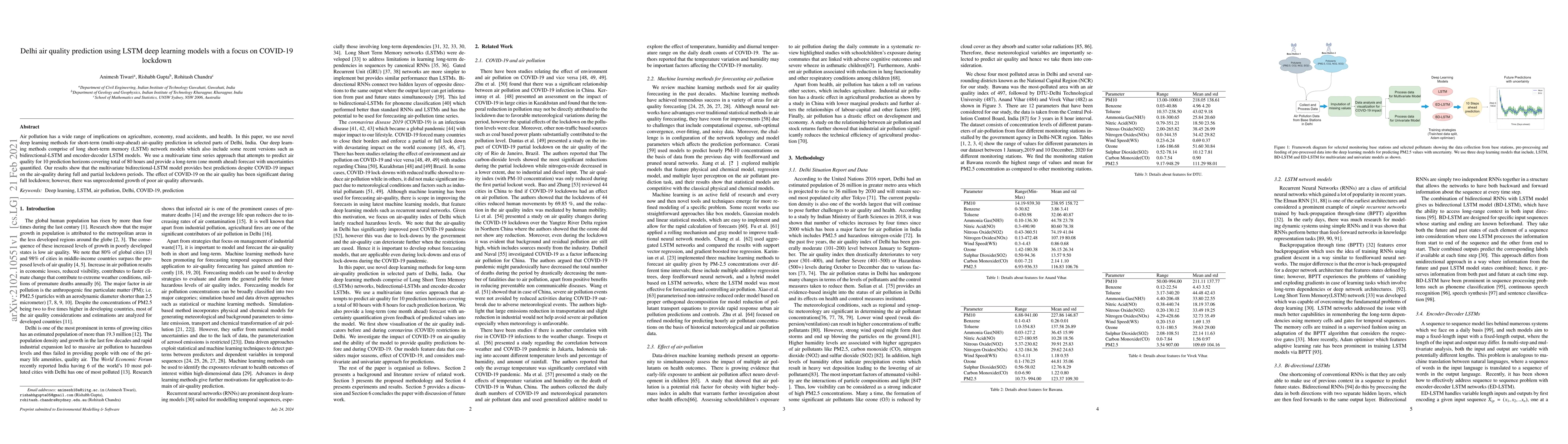 Air pollution has a wide range of implications on agriculture, economy, road accidents, and health. In this paper, we use novel deep learning methods for short-term (multi-step-ahead) air-quality prediction in selected parts of Delhi, India. Our deep learning methods comprise of long short-term memory (LSTM) network models which also include some recent versions such as bidirectional-LSTM and encoder-decoder LSTM models. We use a multivariate time series approach that attempts to predict air quality for 10 prediction horizons covering total of 80 hours and provide a long-term (one month ahead) forecast with uncertainties quantified. Our results show that the multivariate bidirectional-LSTM model provides best predictions despite COVID-19 impact on the air-quality during full and partial lockdown periods. The effect of COVID-19 on the air quality has been significant during full lockdown; however, there was unprecedented growth of poor air quality afterwards.