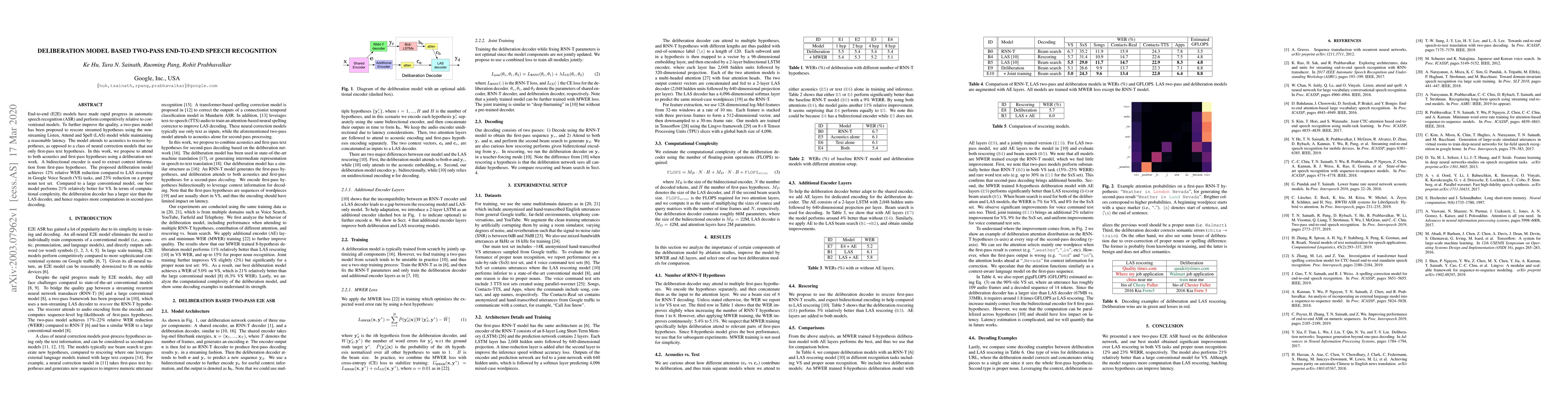 This paper proposes a two-pass end-to-end speech recognition model that uses a deliberation network to rescore hypotheses by attending to both acoustics and first-pass text hypotheses, achieving significant improvements in Word Error Rate (WER) compared to conventional models and LAS rescoring.