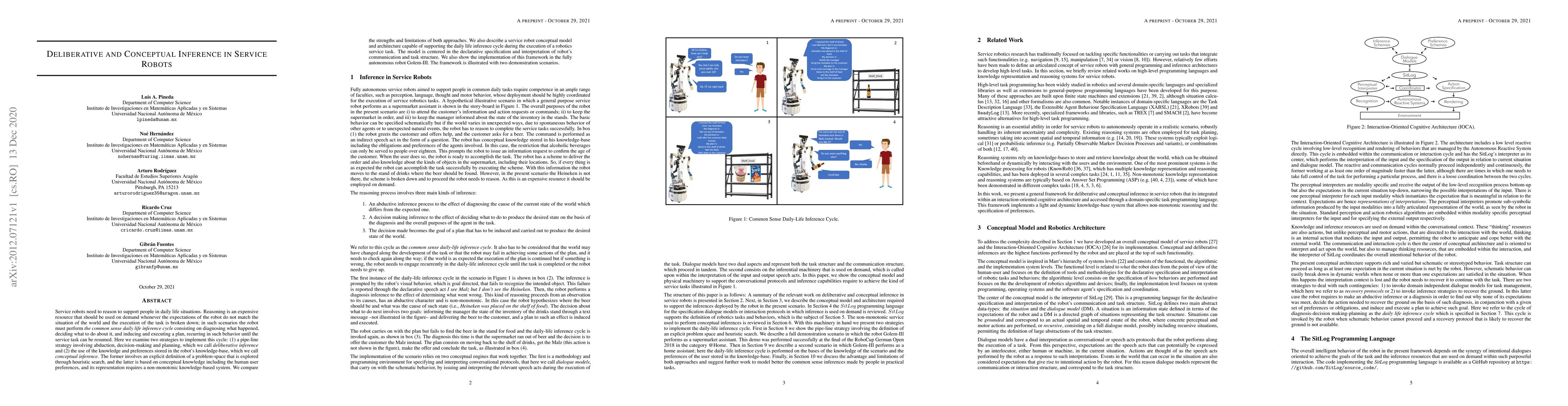 Service robots need to reason to support people in daily life situations. Reasoning is an expensive resource that should be used on demand whenever the expectations of the robot do not match the situation of the world and the execution of the task is broken down; in such scenarios the robot must perform the common sense daily life inference cycle consisting on diagnosing what happened, deciding what to do about it, and inducing and executing a plan, recurring in such behavior until the service task can be resumed. Here we examine two strategies to implement this cycle: (1) a pipe-line strategy involving abduction, decision-making and planning, which we call deliberative inference and (2) the use of the knowledge and preferences stored in the robot's knowledge-base, which we call conceptual inference. The former involves an explicit definition of a problem space that is explored through heuristic search, and the latter is based on conceptual knowledge including the human user preferences, and its representation requires a non-monotonic knowledge-based system. We compare the strengths and limitations of both approaches. We also describe a service robot conceptual model and architecture capable of supporting the daily life inference cycle during the execution of a robotics service task. The model is centered in the declarative specification and interpretation of robot's communication and task structure. We also show the implementation of this framework in the fully autonomous robot Golem-III. The framework is illustrated with two demonstration scenarios.