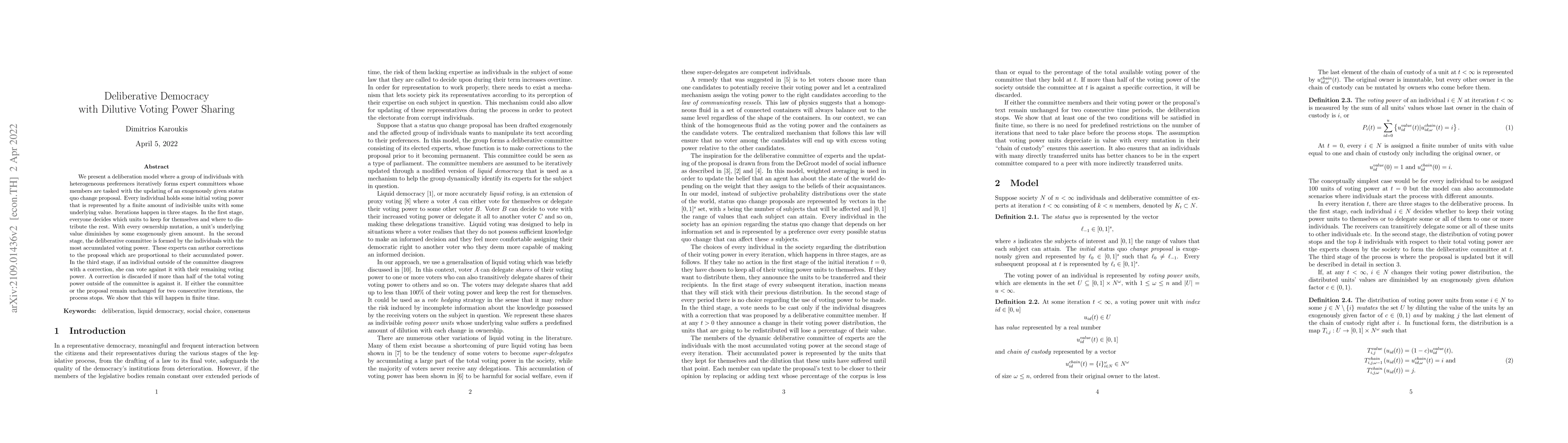 This research introduces a deliberative democracy model where individuals with diverse preferences form expert committees to update a proposal. Voting power, represented by indivisible units, is iteratively redistributed. The process involves three stages: power redistribution, committee formation based on accumulated power, and voting on committee corrections. The model ensures finite termination, demonstrating a novel approach to consensus-building in deliberative democracy.