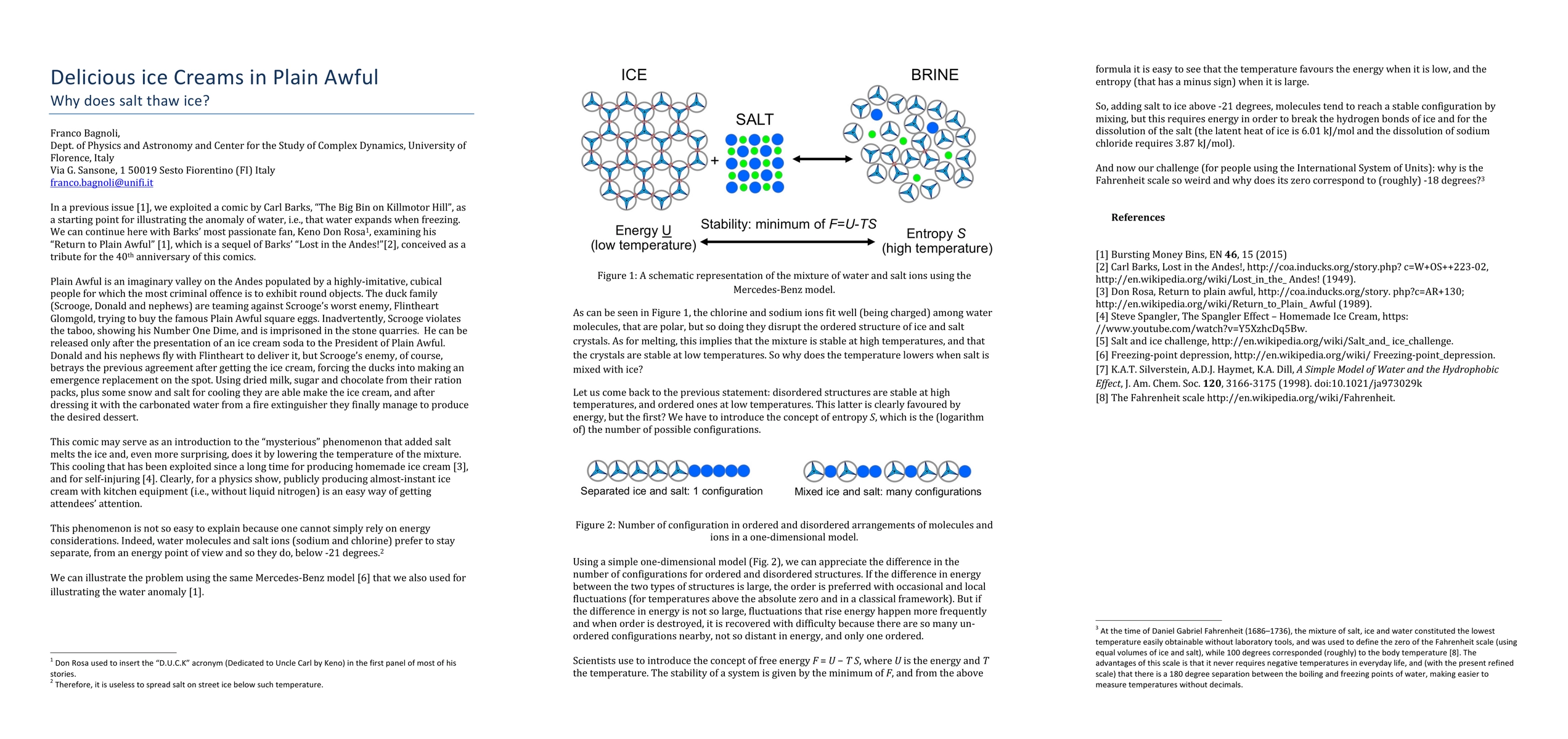 Plain Awful is an imaginary valley on the Andes populated by a highly-imitative, cubical people for which the most criminal offence is to exhibit round objects. The duck family (Scrooge, Donald and nephews) are teaming against Scrooge's worst enemy, Flintheart Glomgold, trying to buy the famous Plain Awful square eggs. Inadvertently, Scrooge violates the taboo, showing his Number One Dime, and is imprisoned in the stone quarries. He can be released only after the presentation of an ice cream soda to the President of Plain Awful. Donald and his nephews fly with Flintheart to deliver it, but Scrooge's enemy, of course, betrays the previous agreement after getting the ice cream, forcing the ducks into making an emergence replacement on the spot. Using dried milk, sugar and chocolate from their ration packs, plus some snow and salt for cooling they are able make the ice cream, and after dressing it with the carbonated water from a fire extinguisher they finally manage to produce the desired dessert. This comic may serve as an introduction to the "mysterious" phenomenon that added salt melts the ice and, even more surprising, does it by lowering the temperature of the mixture.