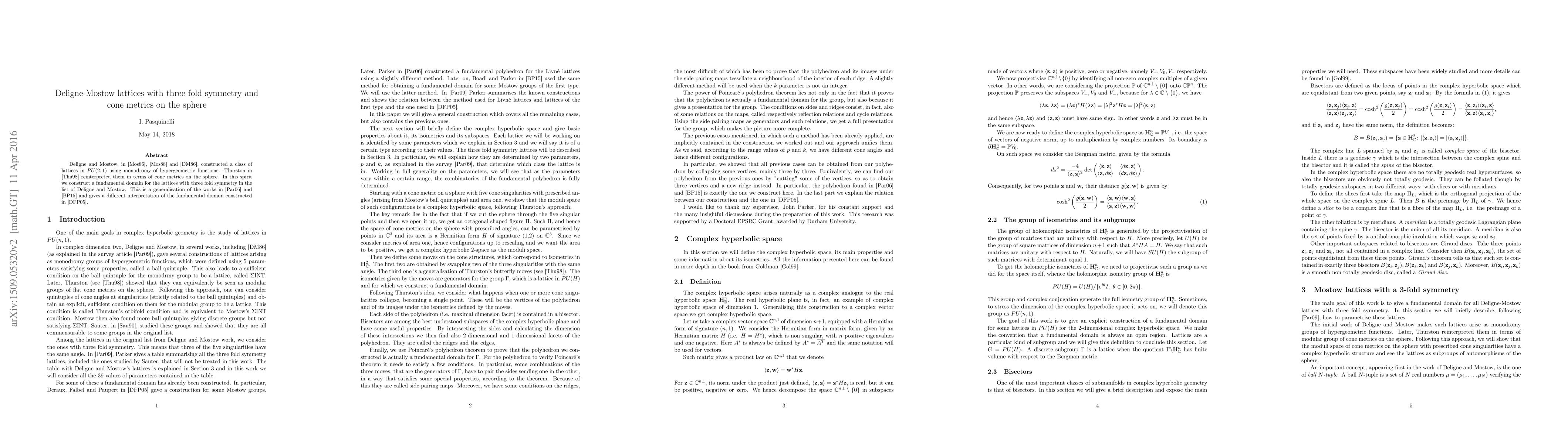 This paper constructs a fundamental domain for Deligne-Mostow lattices exhibiting three fold symmetry, generalizing previous work by Parker, Boadi, and others. It reinterprets these lattices in terms of cone metrics on the sphere, offering a new perspective on the fundamental domain previously developed by Deraux, Falbel, and Paupert.