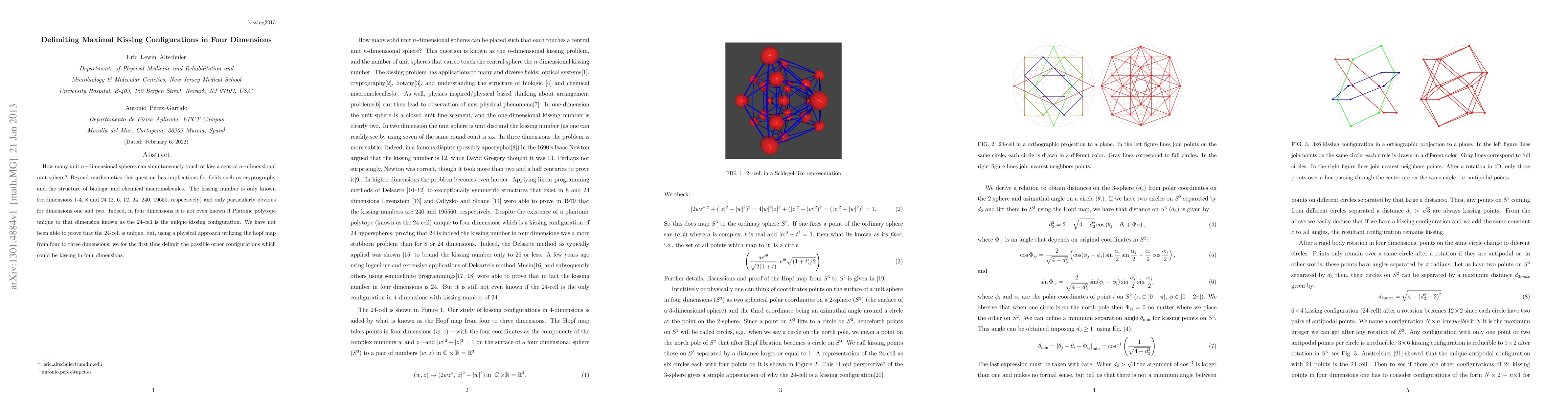 How many unit $n-$dimensional spheres can simultaneously touch or kiss a central $n-$dimensional unit sphere? Beyond mathematics this question has implications for fields such as cryptography and the structure of biologic and chemical macromolecules. The kissing number is only known for dimensions 1-4, 8 and 24 (2, 6, 12, 24, 240, 19650, respectively) and only particularly obvious for dimensions one and two. Indeed, in four dimensions it is not even known if Platonic polytope unique to that dimension known as the 24-cell is the unique kissing configuration. We have not been able to prove that the 24-cell is unique, but, using a physical approach utilizing the hopf map from four to three dimensions, we for the first time delimit the possible other configurations which could be kissing in four dimensions.