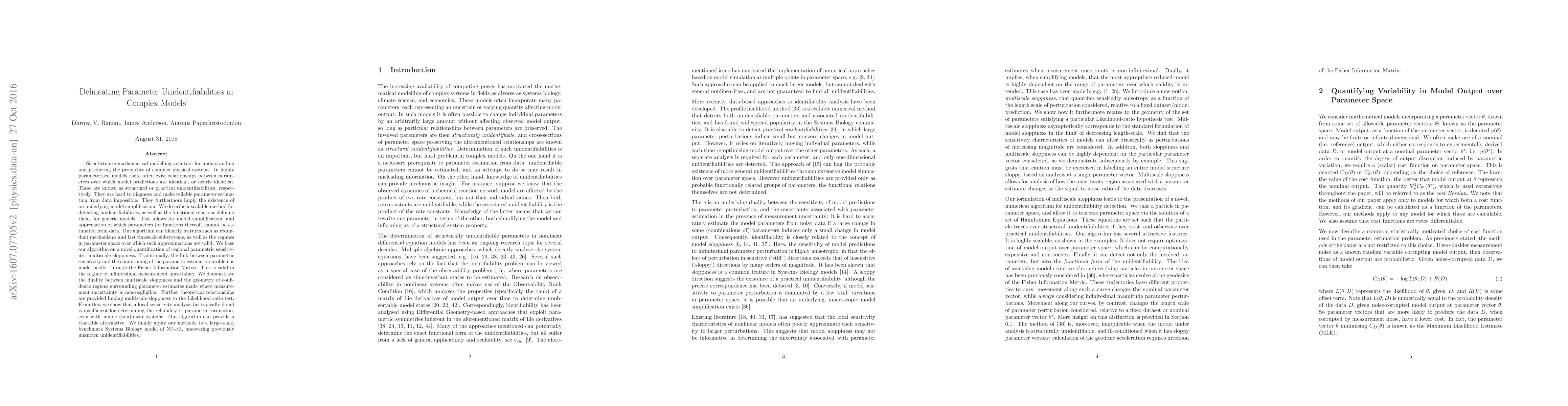 This paper introduces a scalable method for identifying structural and practical unidentifiabilities in highly parameterized models, enabling model simplification and revealing parameters that cannot be reliably estimated from data. The proposed algorithm, based on multiscale sloppiness, provides a novel approach to detect redundant mechanisms and fast timescale subsystems, offering a more reliable alternative to traditional local sensitivity analyses.