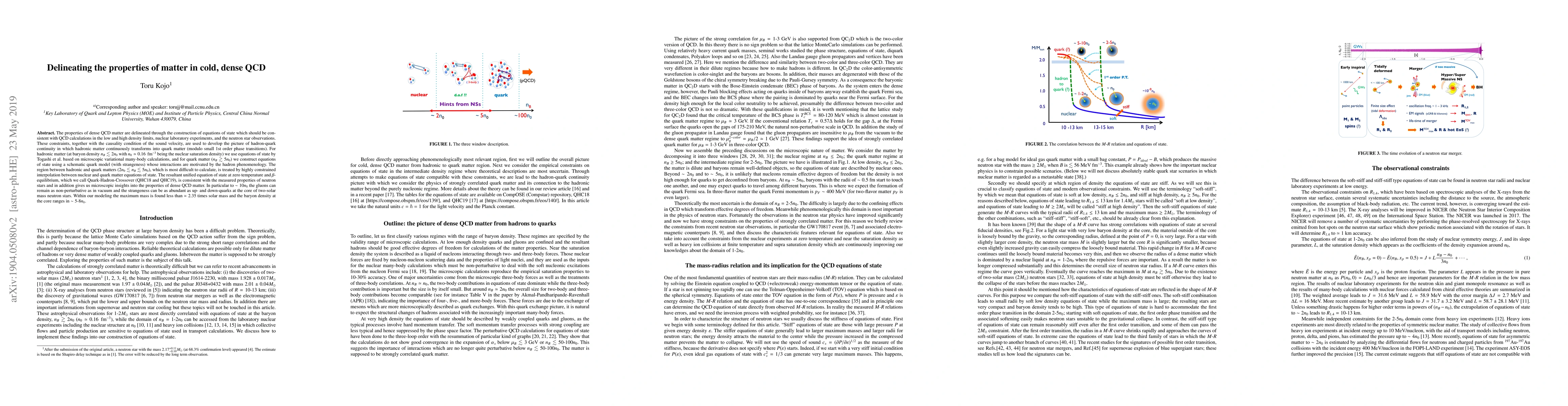 The properties of dense QCD matter are delineated through the construction of equations of state which should be consistent with QCD calculations in the low and high density limits, nuclear laboratory experiments, and the neutron star observations. These constraints, together with the causality condition of the sound velocity, are used to develop the picture of hadron-quark continuity in which hadronic matter continuously transforms into quark matter (modulo small 1st order phase transitions). For hadronic matter (at baryon density nB > ~2n0 with n0 ~ 0.16 fm^(-3) being the nuclear saturation density) we use equations of state by Togashi et al. based on microscopic variational many-body calculations, and for quark matter (nB > ~5n0) we construct equations of state using a schematic quark model (with strangeness) whose interactions are motivated by the hadron phenomenology. The region between hadronic and quark matters (~2n0 < nB < ~5n0), which is most difficult to calculate, is treated by highly constrained interpolation between nuclear and quark matter equations of state. The resultant unified equation of state at zero temperature and beta-equilibrium, which we call Quark-Hadron-Crossover (QHC18 and QHC19), is consistent with the measured properties of neutron stars and in addition gives us microscopic insights into the properties of dense QCD matter. In particular to ~10n0 the gluons can remain as non-perturbative as in vacuum and the strangeness can be as abundant as up- and down-quarks at the core of two-solar mass neutron stars. Within our modeling the maximum mass is found less than ~2.35 times solar mass and the baryon density at the core ranges in ~5-8n0.